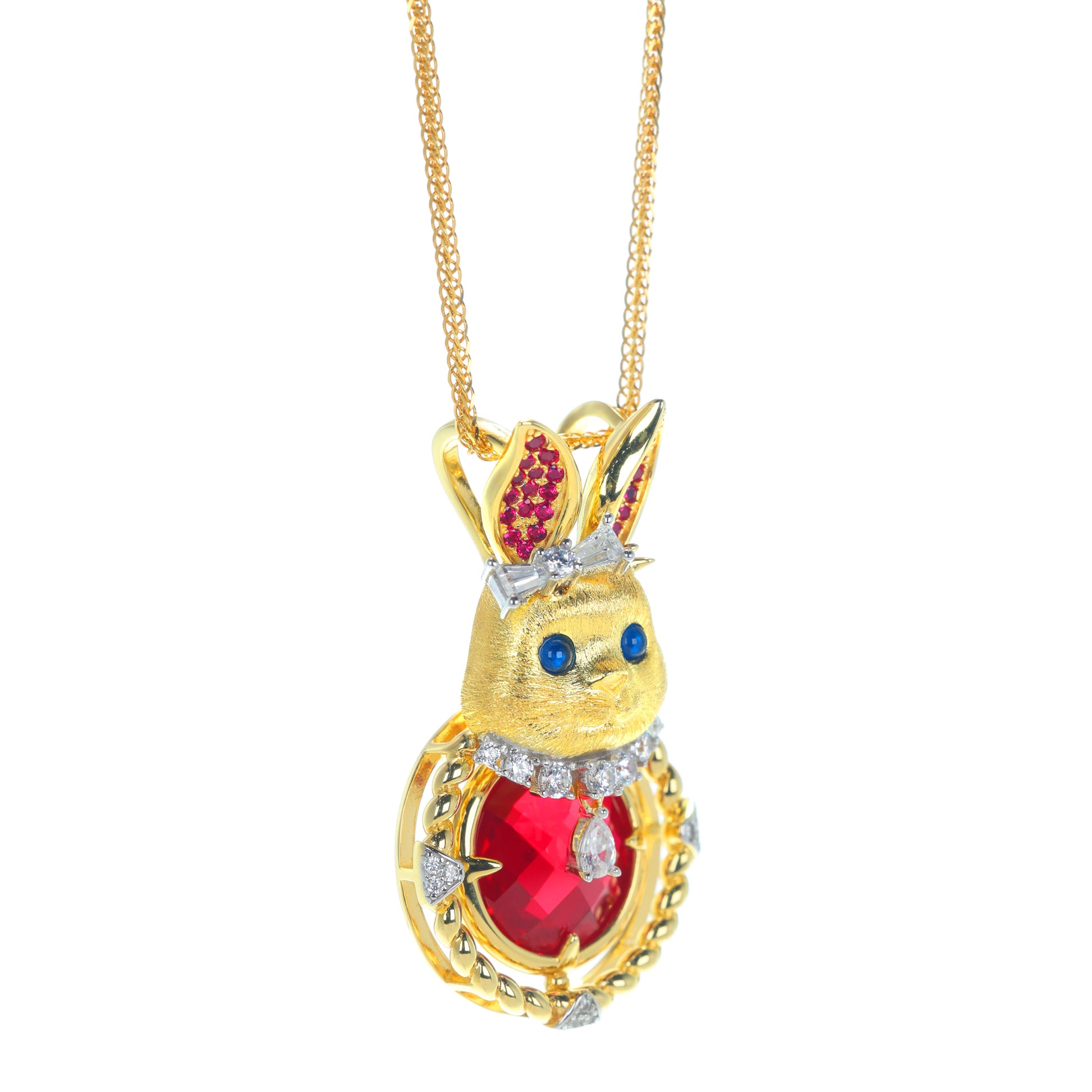 Limited edition Micro-setting Ruby color lab created stones Lucky rabbit rotate pendant, sterling silver