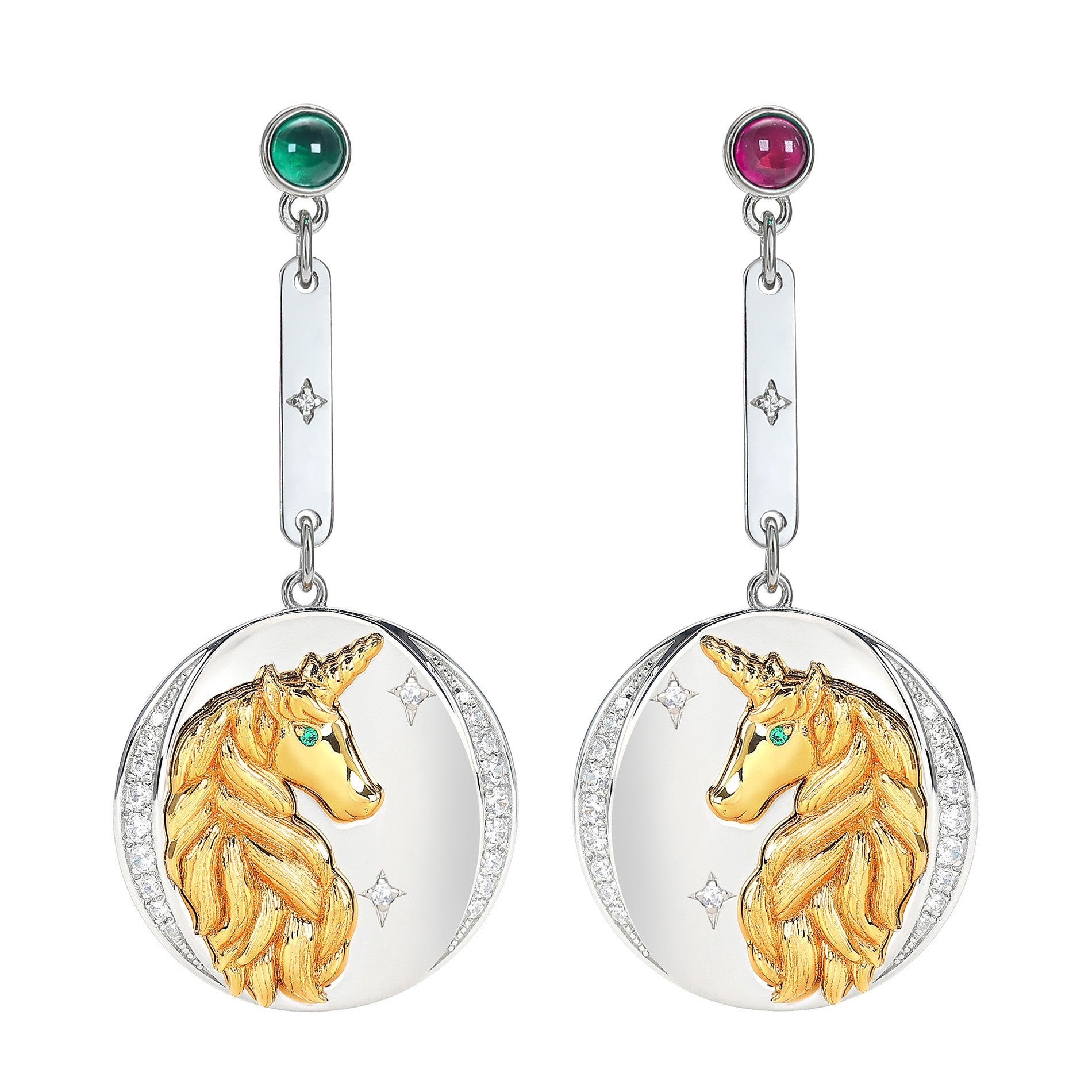 Micro-setting ancient coins selection Lab created stones The unicorn earrings, sterling silver. Double platting.