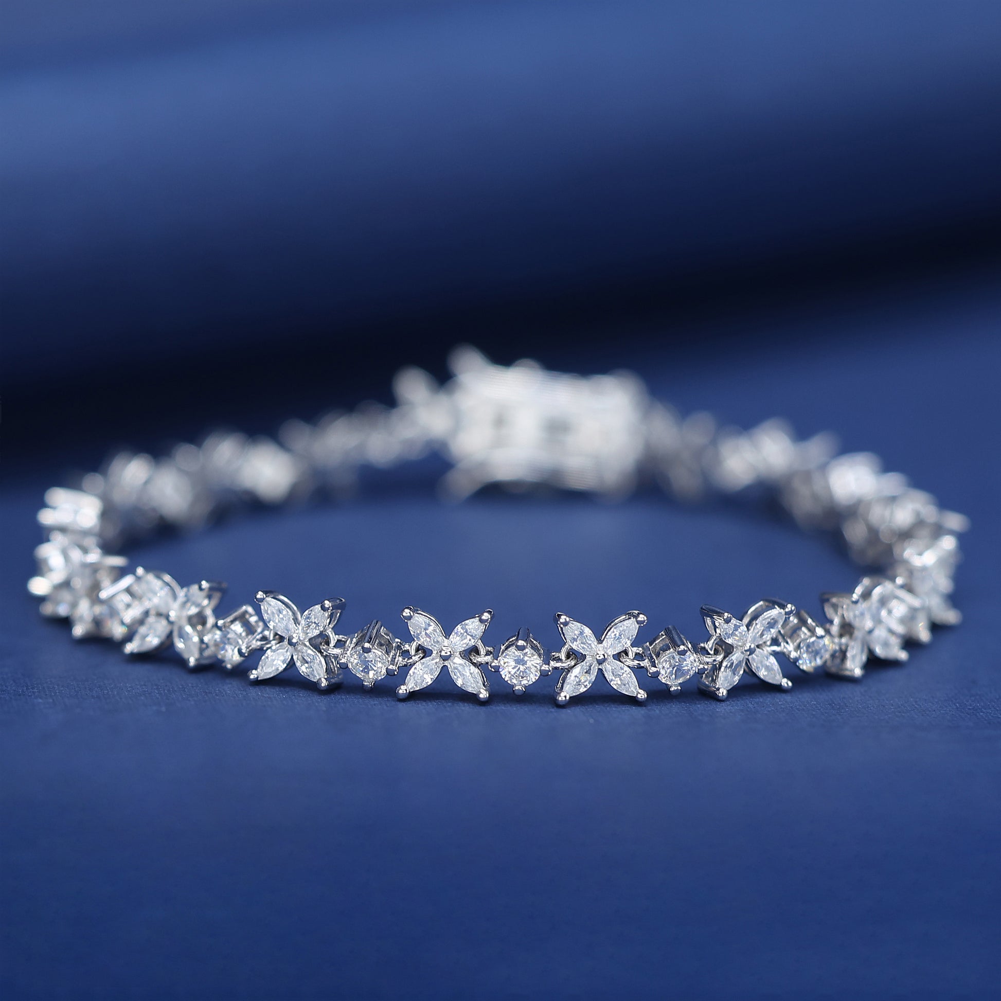 Micro-setting Lab created stones Four-petal floral bracelet, sterling silver.