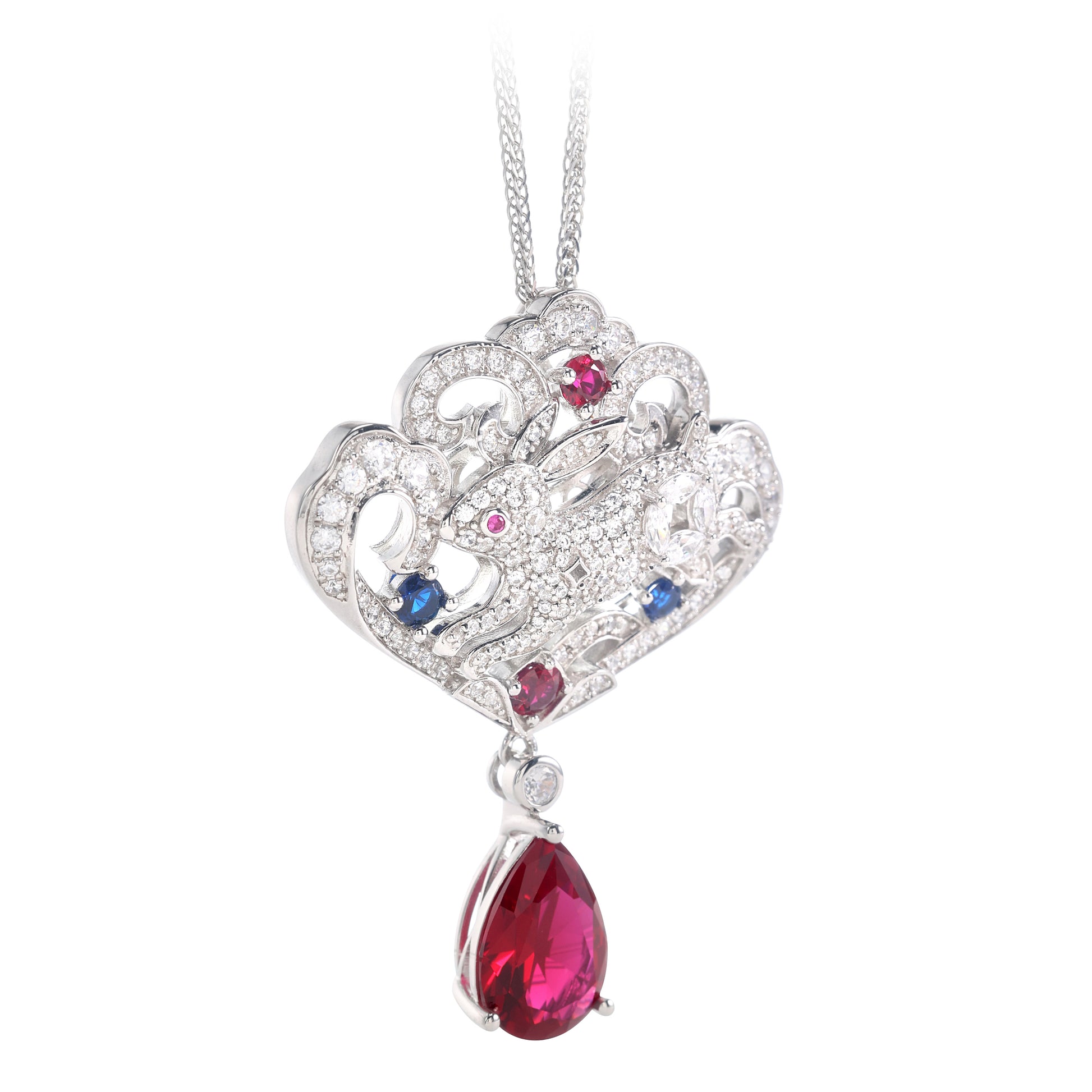 Customized only 1 piece Micro-setting Ruby color Lab created stones The running rabbit pendant, sterling silver