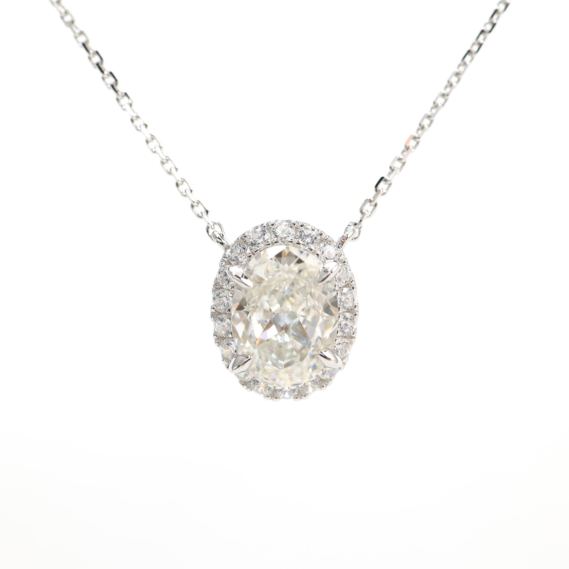 Pigeon egg shape G color Lab created stones necklace, sterling silver. Micro-setting