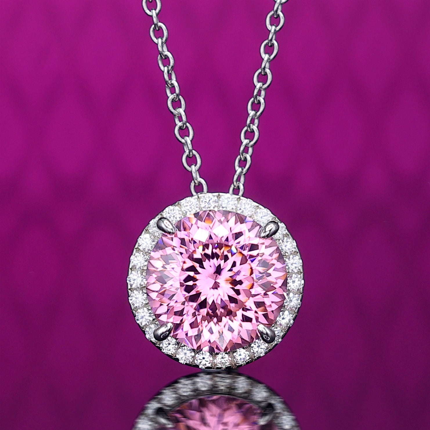Micro-setting Pink diamond color Firework cut Lab created stones round shape necklace, sterling silver, (5 carat).