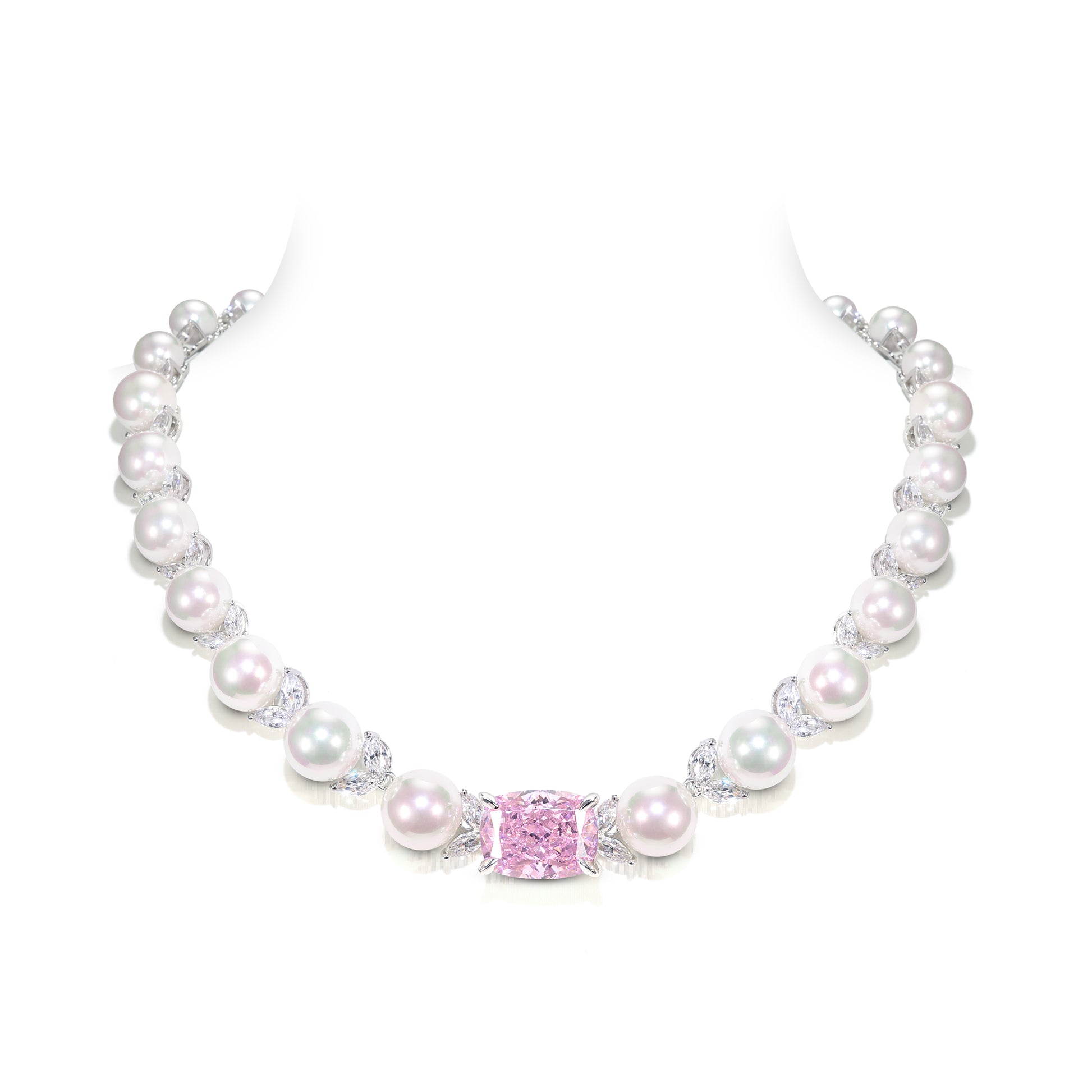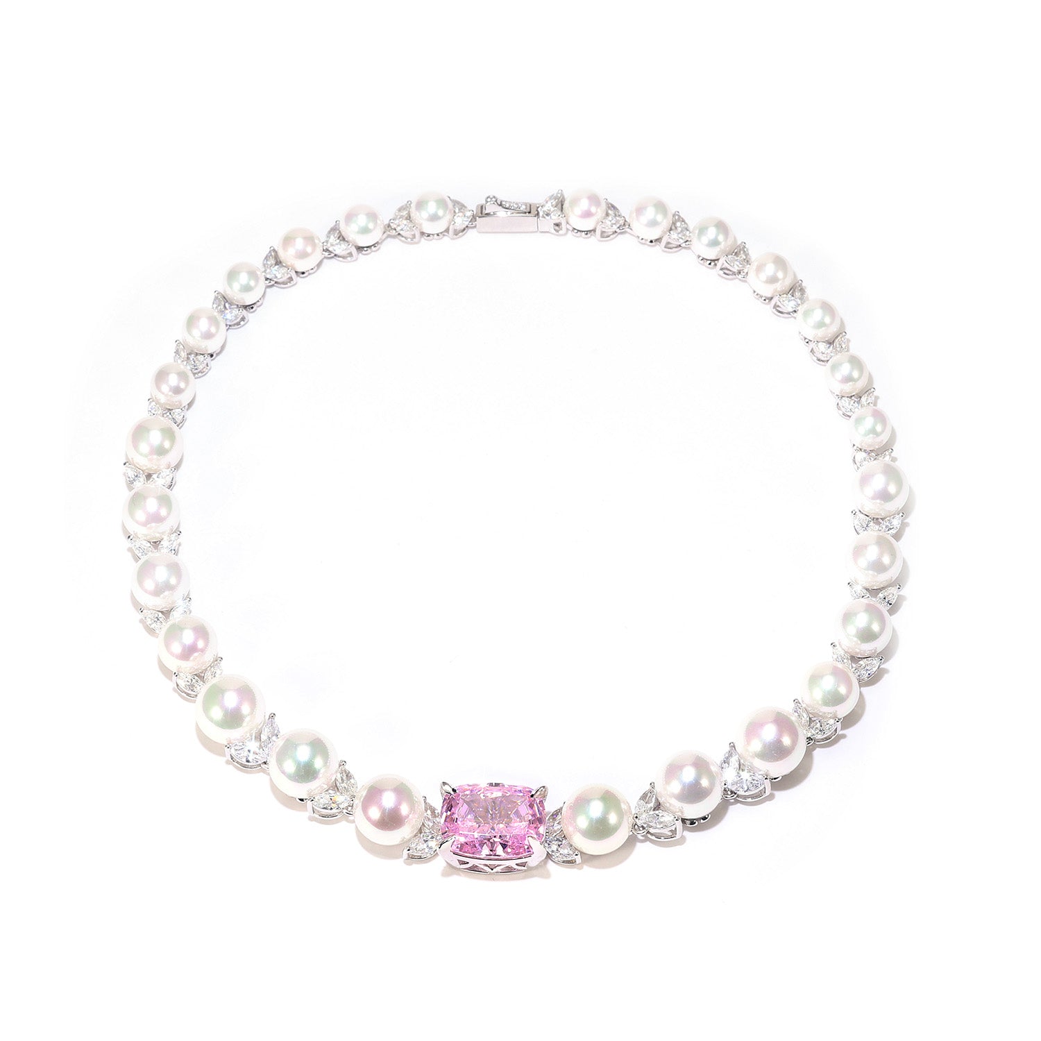 Micro-setting Pink diamond color Lab created stones Romantic Luxury White Shell Pearl necklace, sterling silver