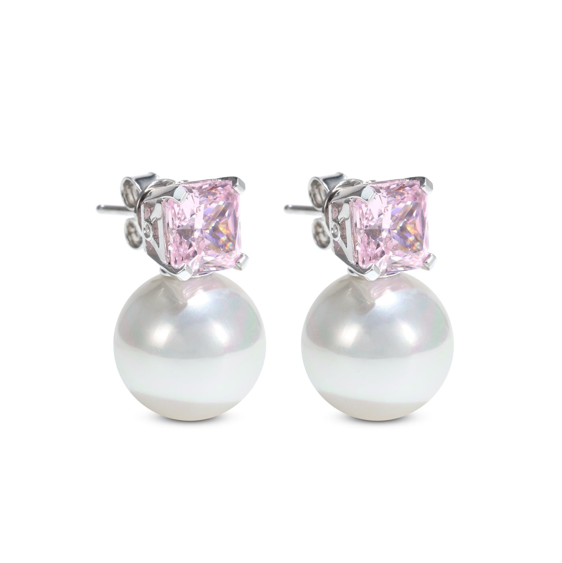 Micro-setting Pink diamond color Lab created stones White shell Pearl earrings, sterling silver.