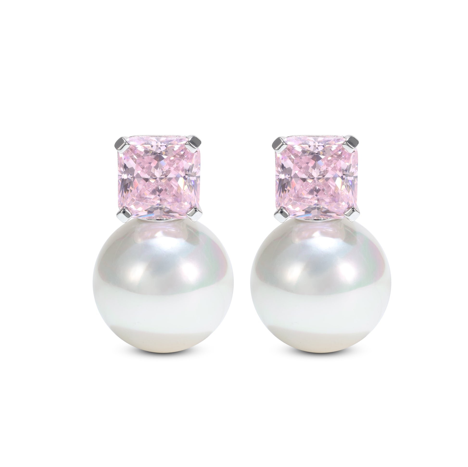 Micro-setting Pink diamond color Lab created stones White shell Pearl earrings, sterling silver