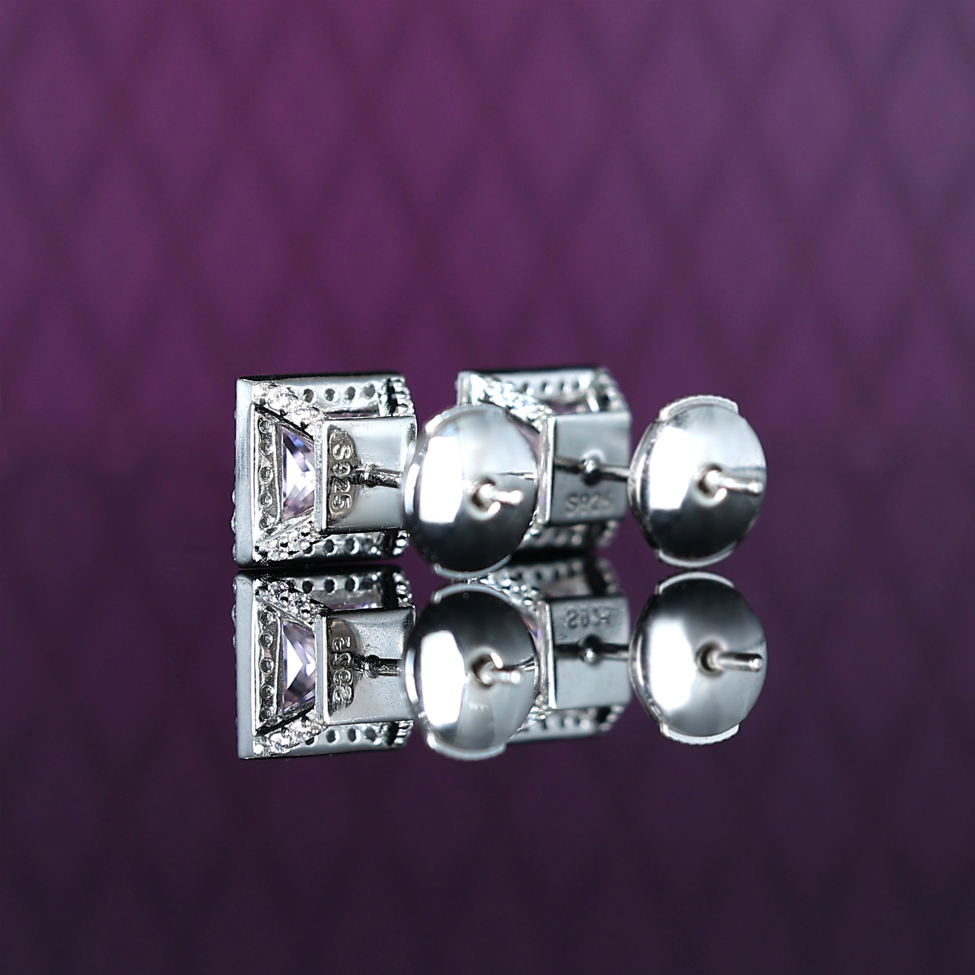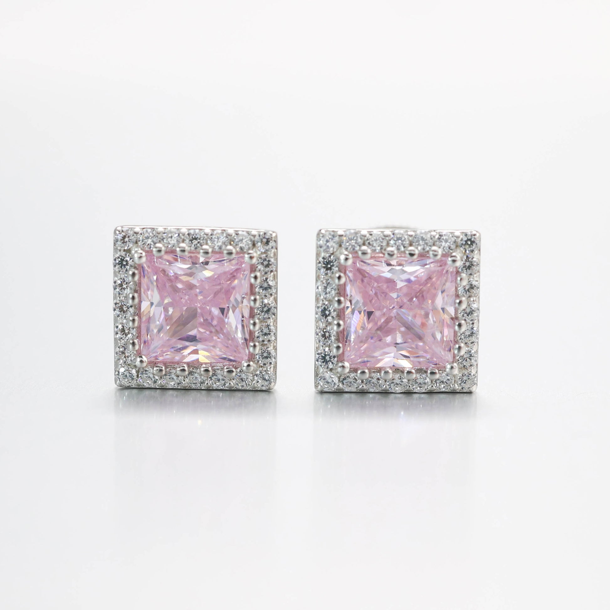 Micro-setting Pink diamond color princess cut Lab created stones Square shape detailed ear studs, sterling silver.