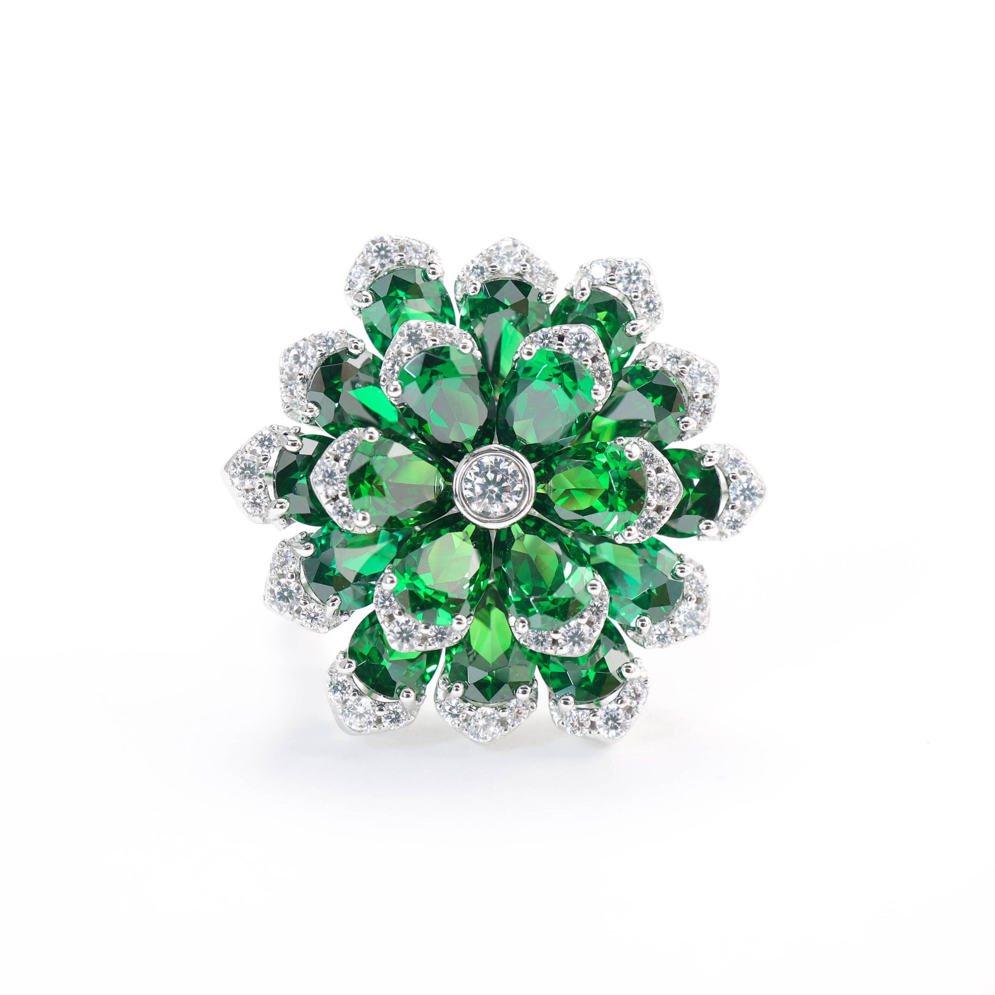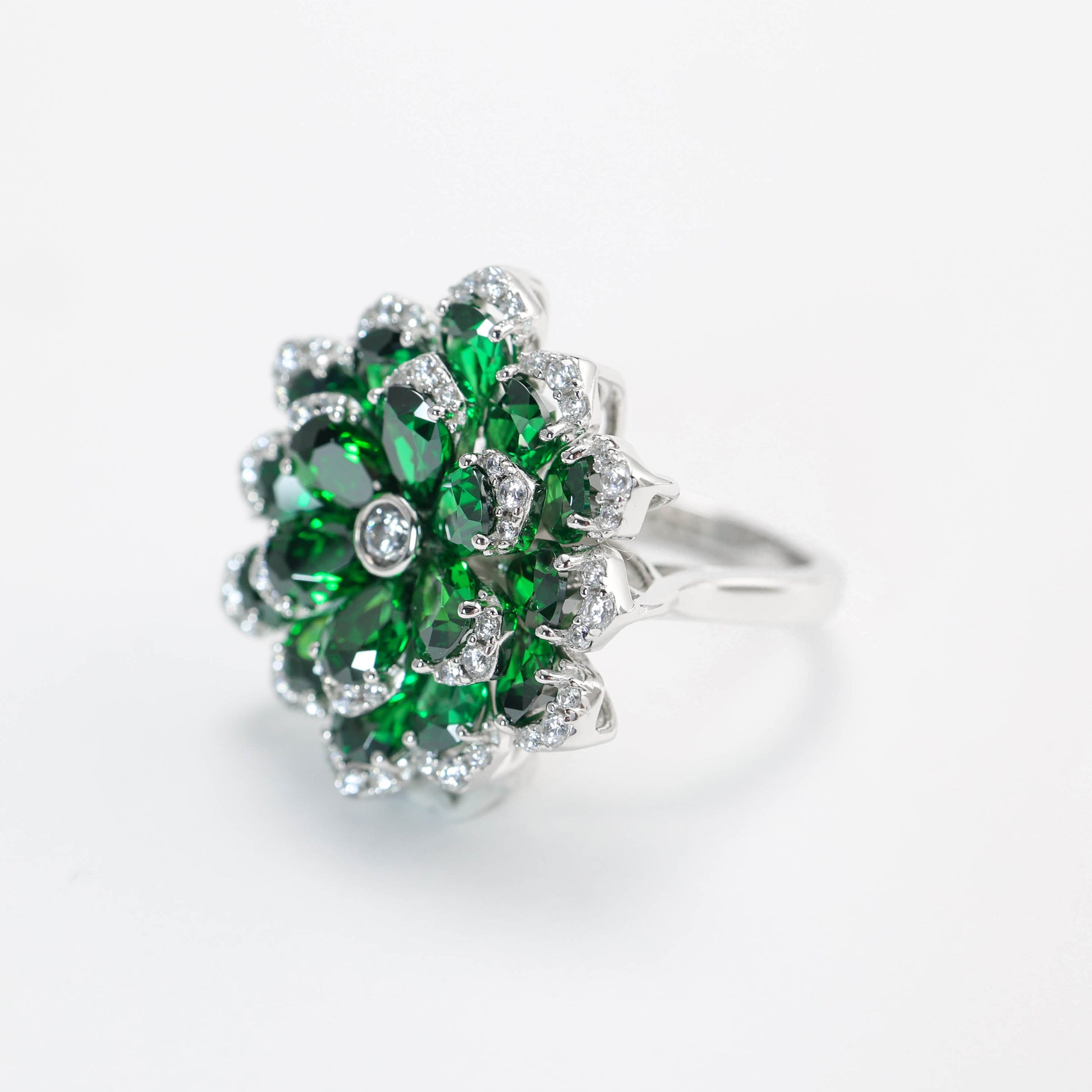 Micro-setting Preserved Flower Tsavorite color Lab created stones ring, sterling silver.