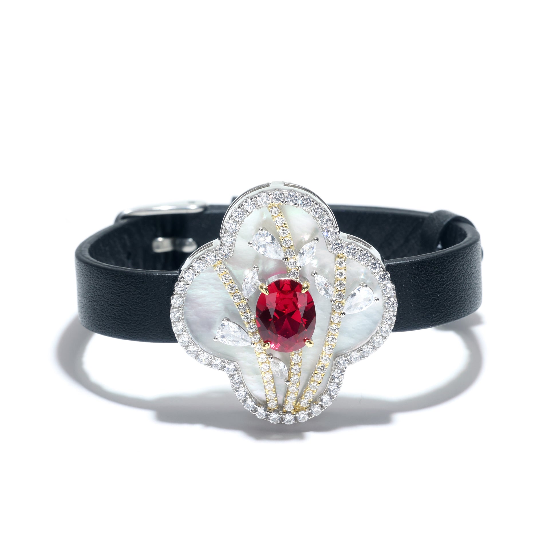 Micro-setting Ruby color Lab created stones and white shell Black belt bracelet, sterling silver