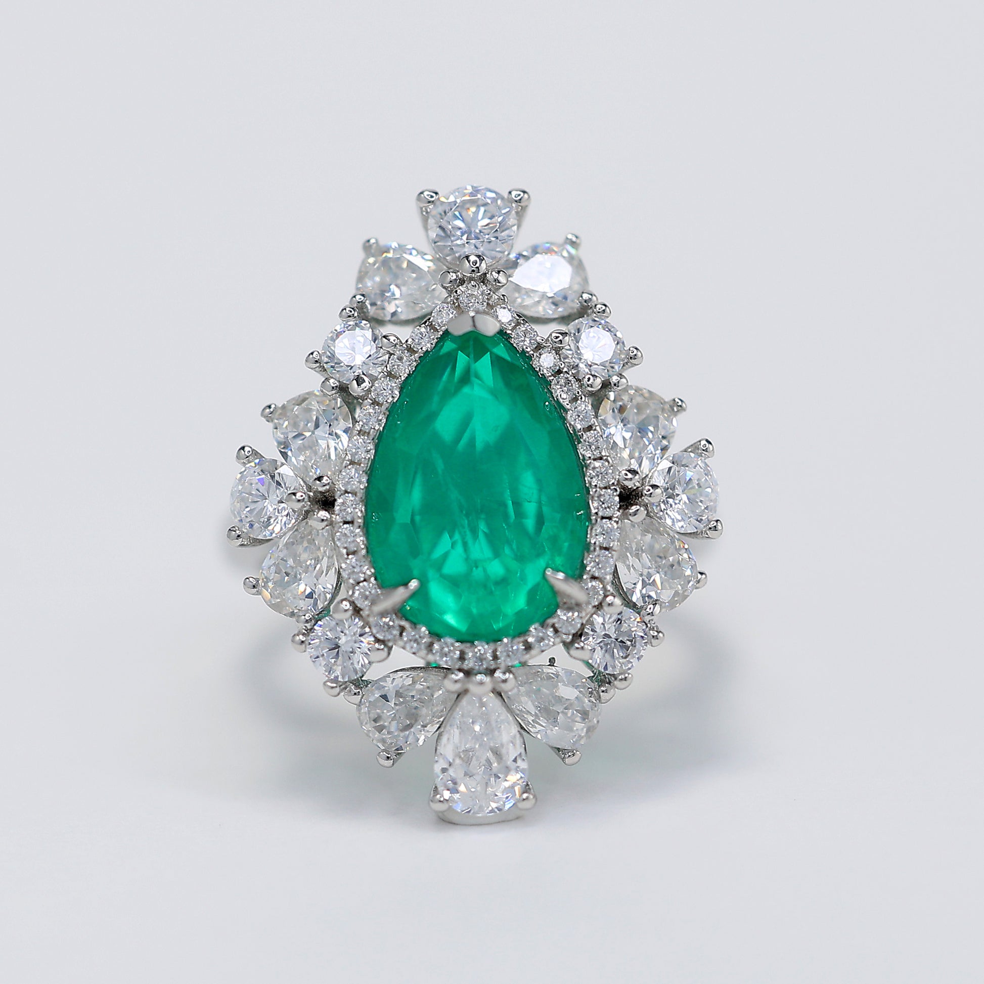 Micro-setting Emerald color Lab created stones waterdrop lace ring, sterling silver.