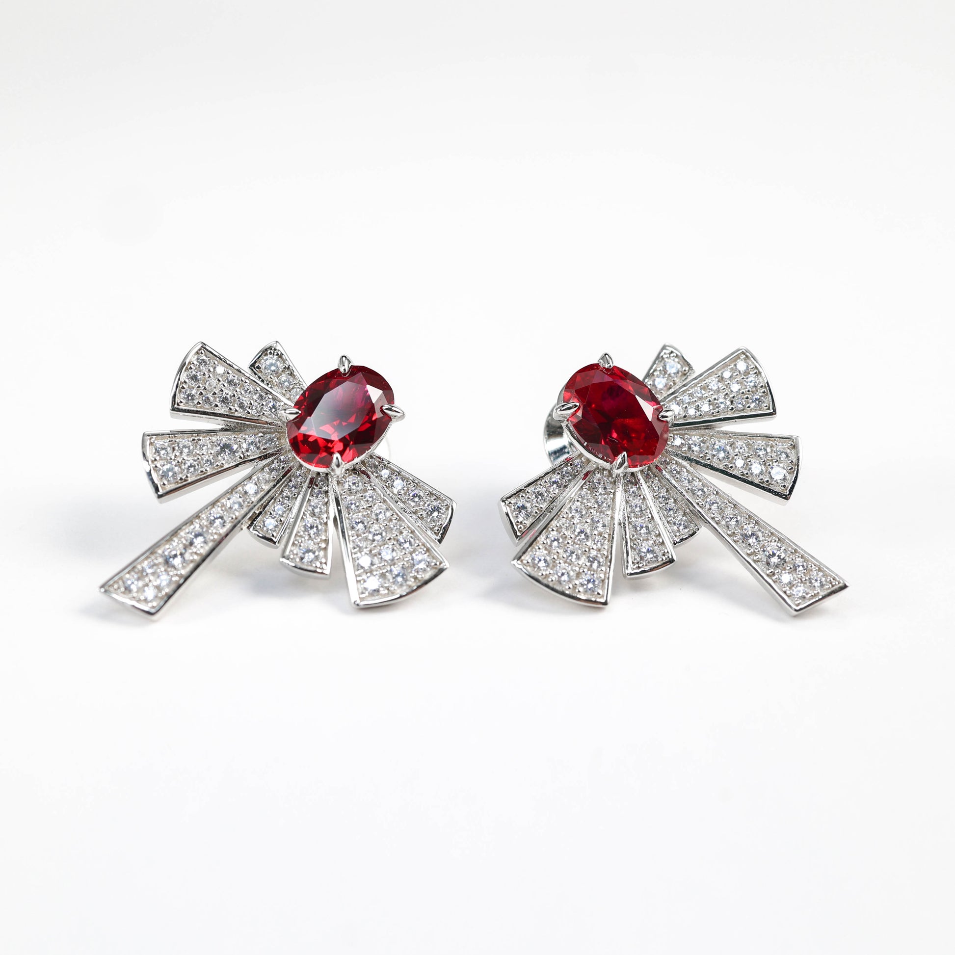 Micro-setting Ruby color Lab created stones proud as a peacock earrings, sterling silver.