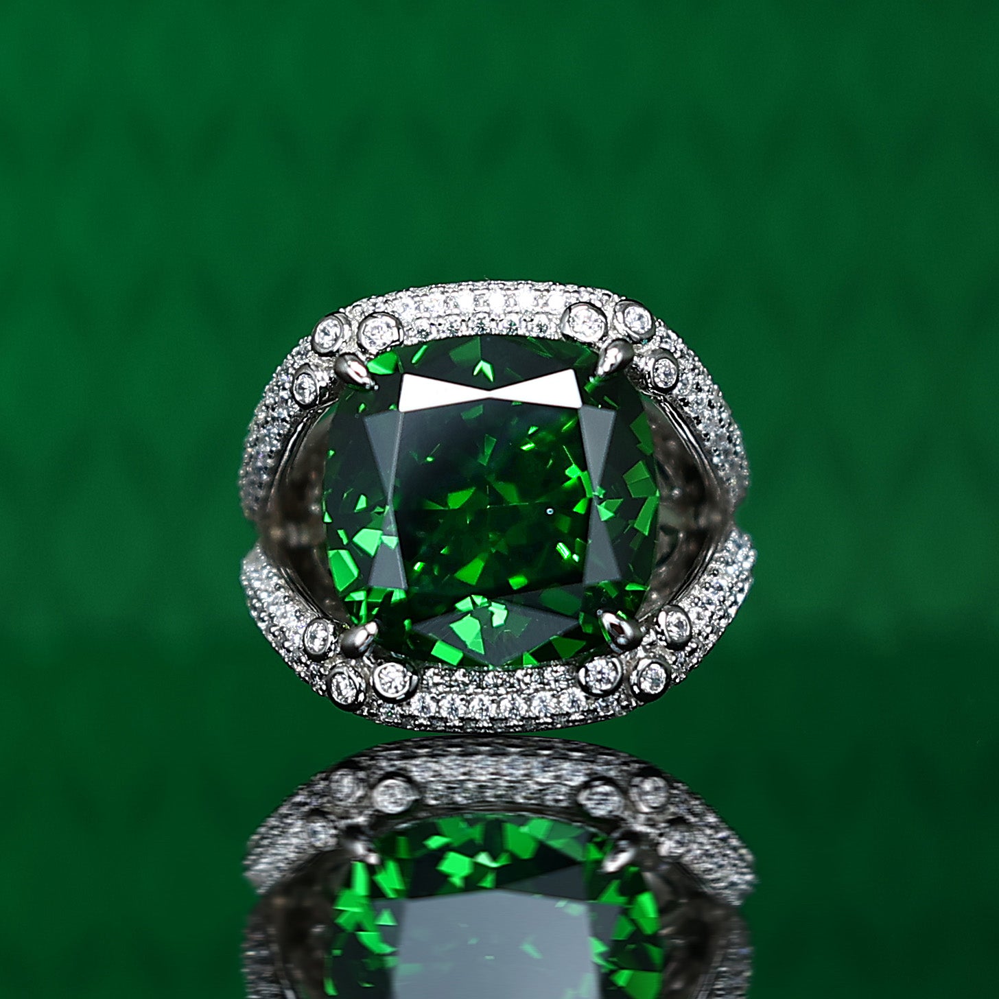 Micro-setting Tsavorite Olive green color Lab created stones 4 prong detailed ring, sterling silver. (18 carat)