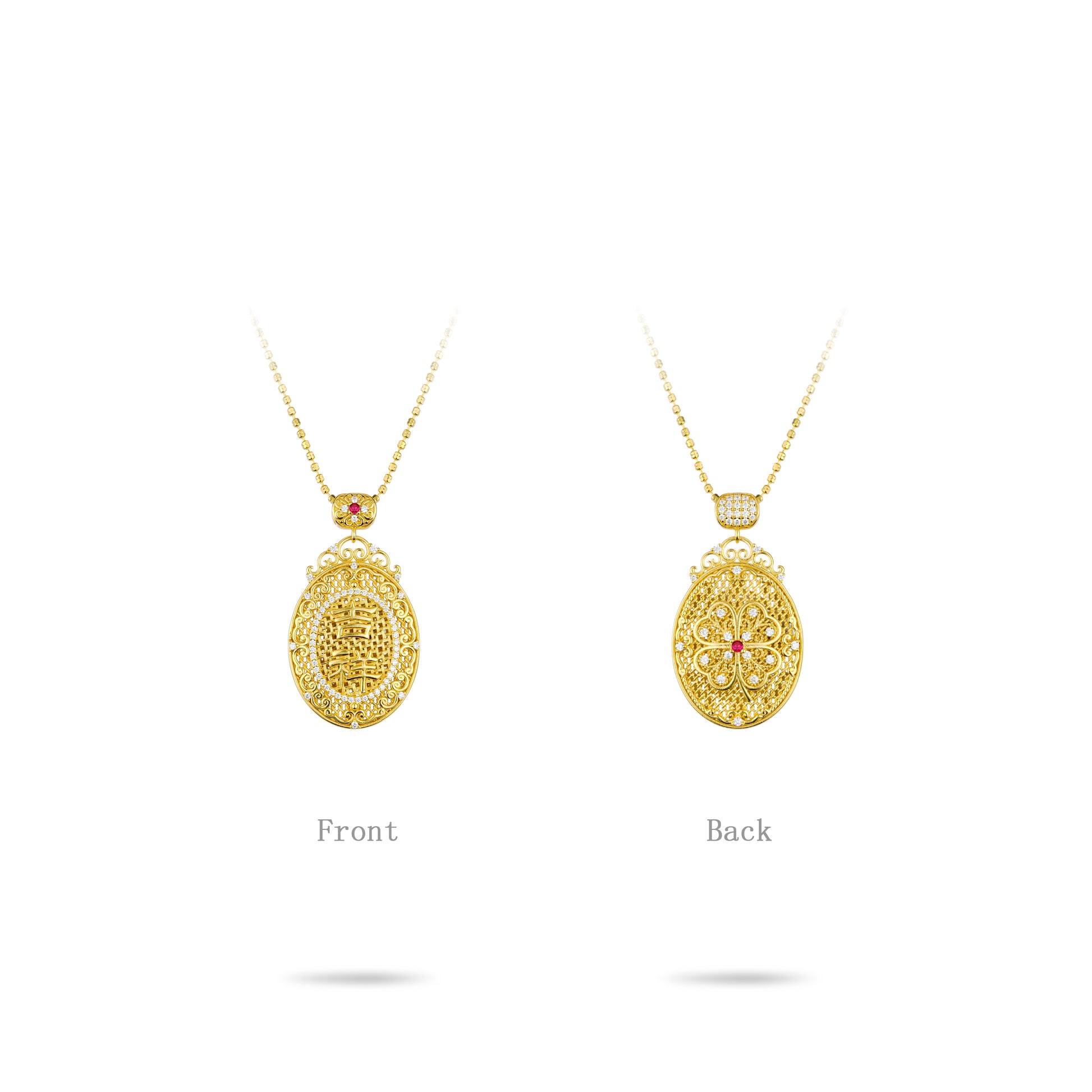 Dual-Sided Elegance: The pendant showcases a dual-sided design, featuring Golden hollow carved Chinese letter "Ji Xiang" meaning "auspicious" on the front and Golden carved four leaf clover with red accents on the back. This versatile design allows you to wear the pendant in two distinct styles, each exuding its own charm.