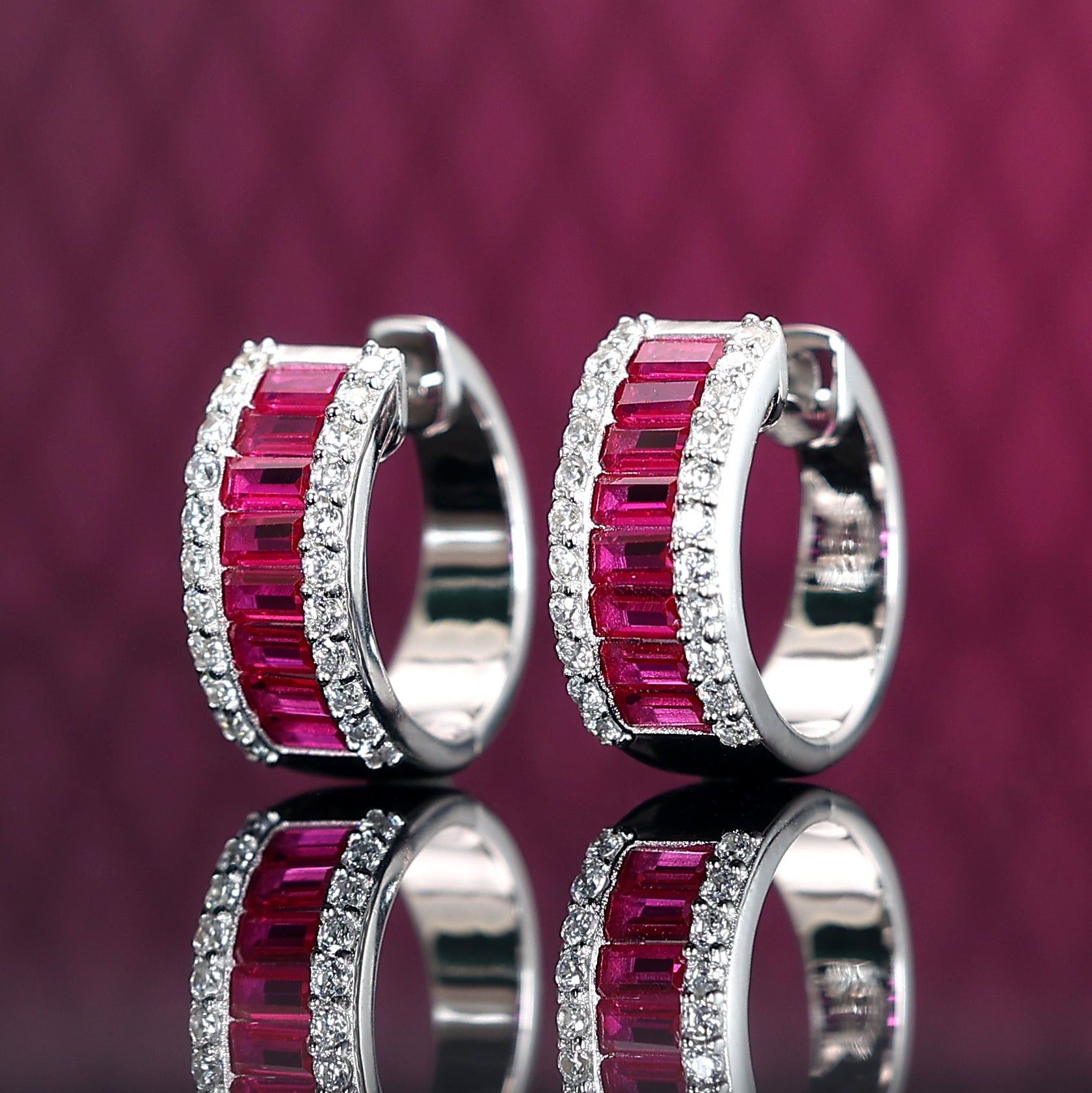 Micro-setting Ruby color invisible setting Lab created stones mordern ear loops, sterling silver.