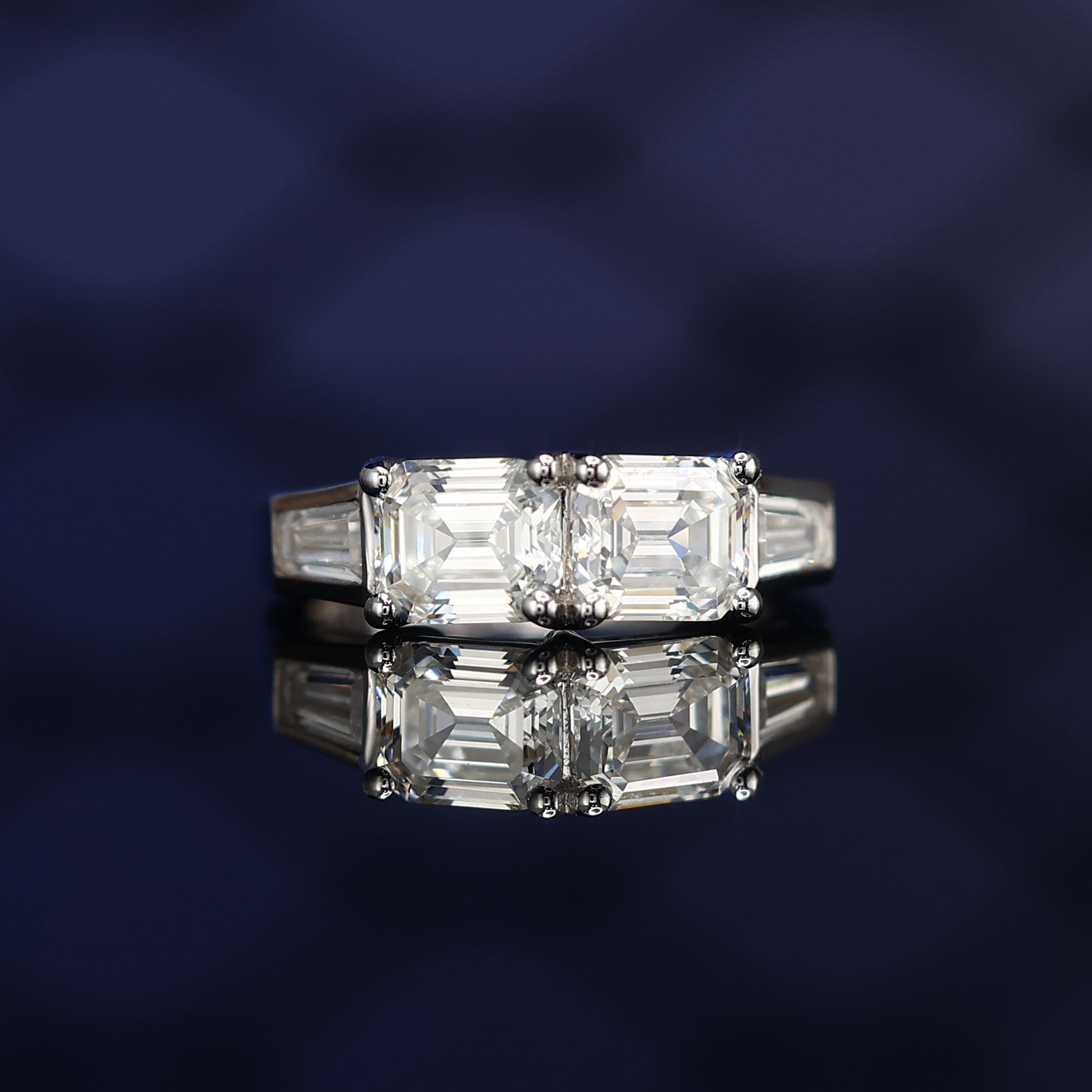 Clear diamond color Lab created stones Emerald cut 4 stones ring, sterling silver.