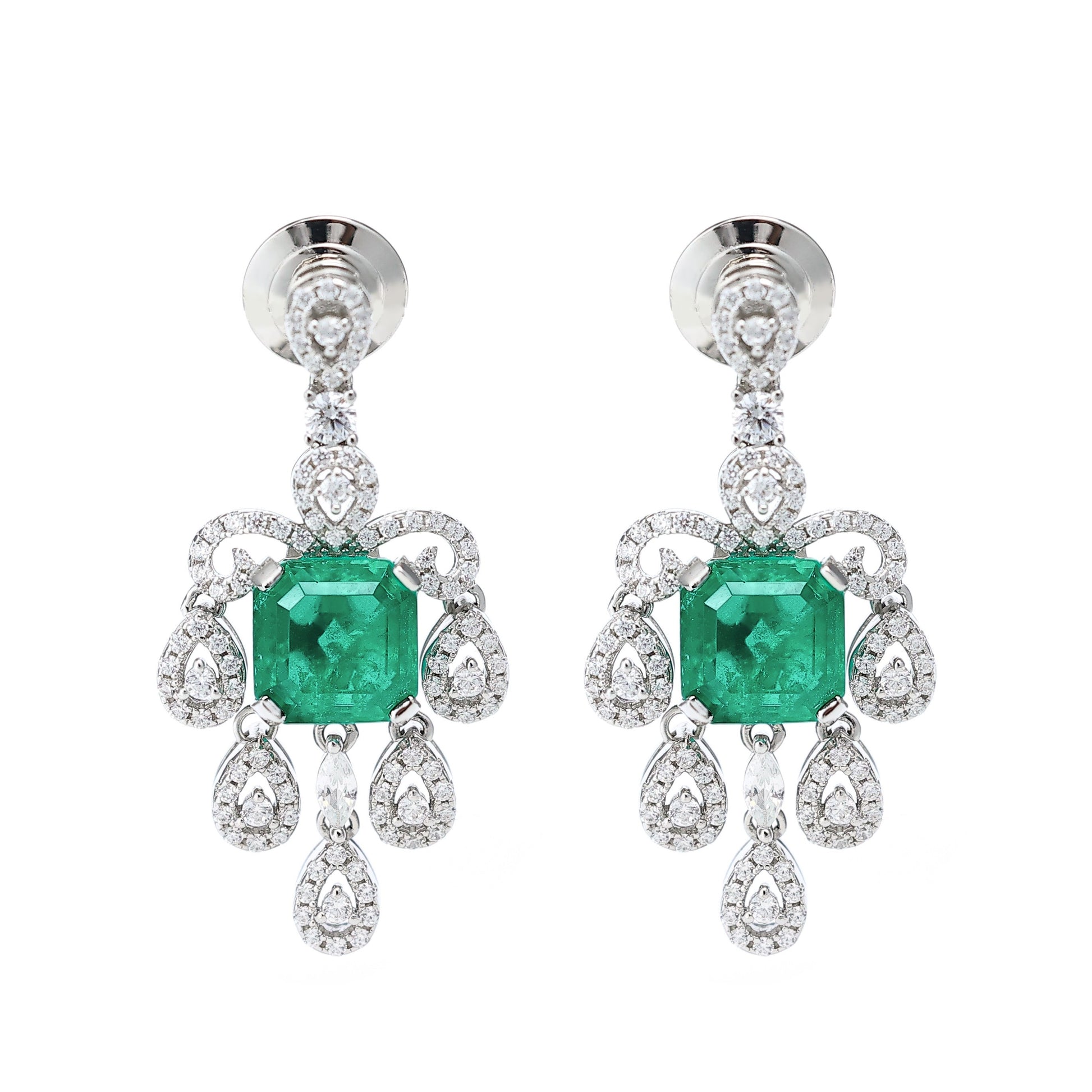 Micro-setting Square teardrop shape emerald color lab created stones Palace style earrings, sterling silver.