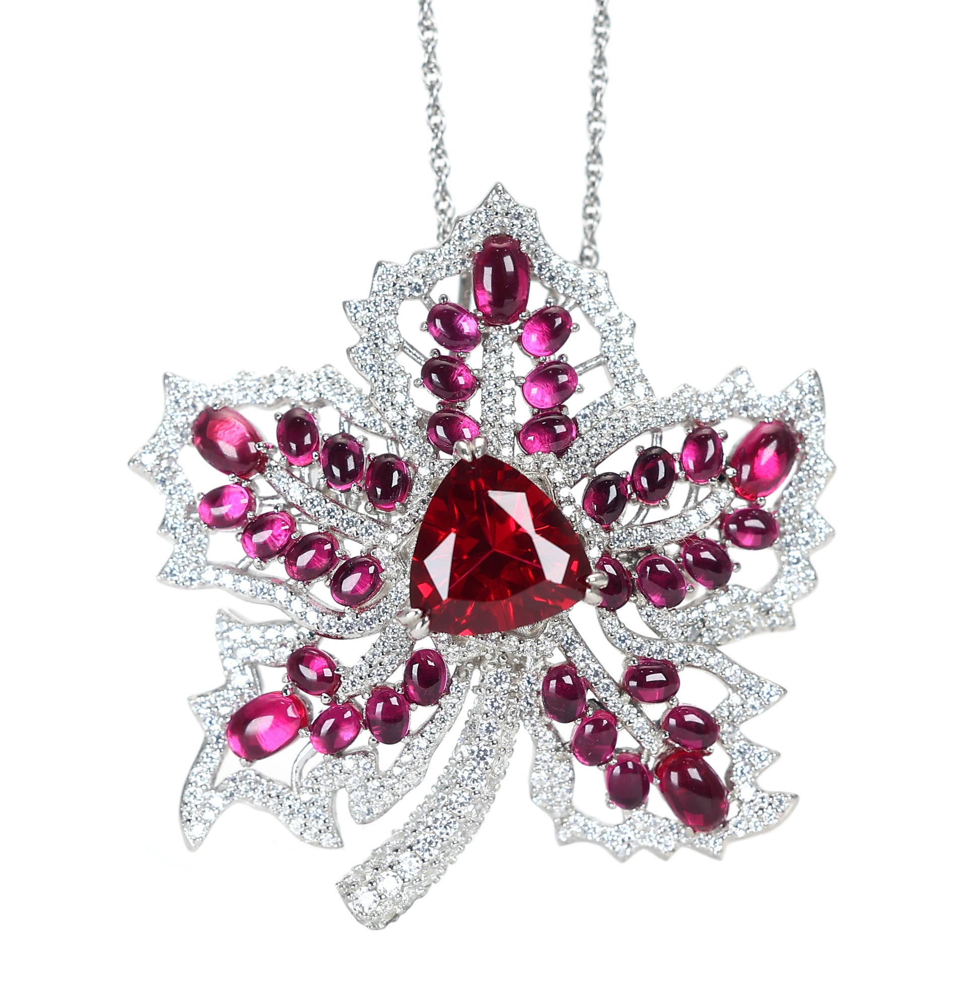 Promotional design Micro-setting Ruby color Lab created stones multi-purpose red Maple leaf pendant and brooch, sterling silver