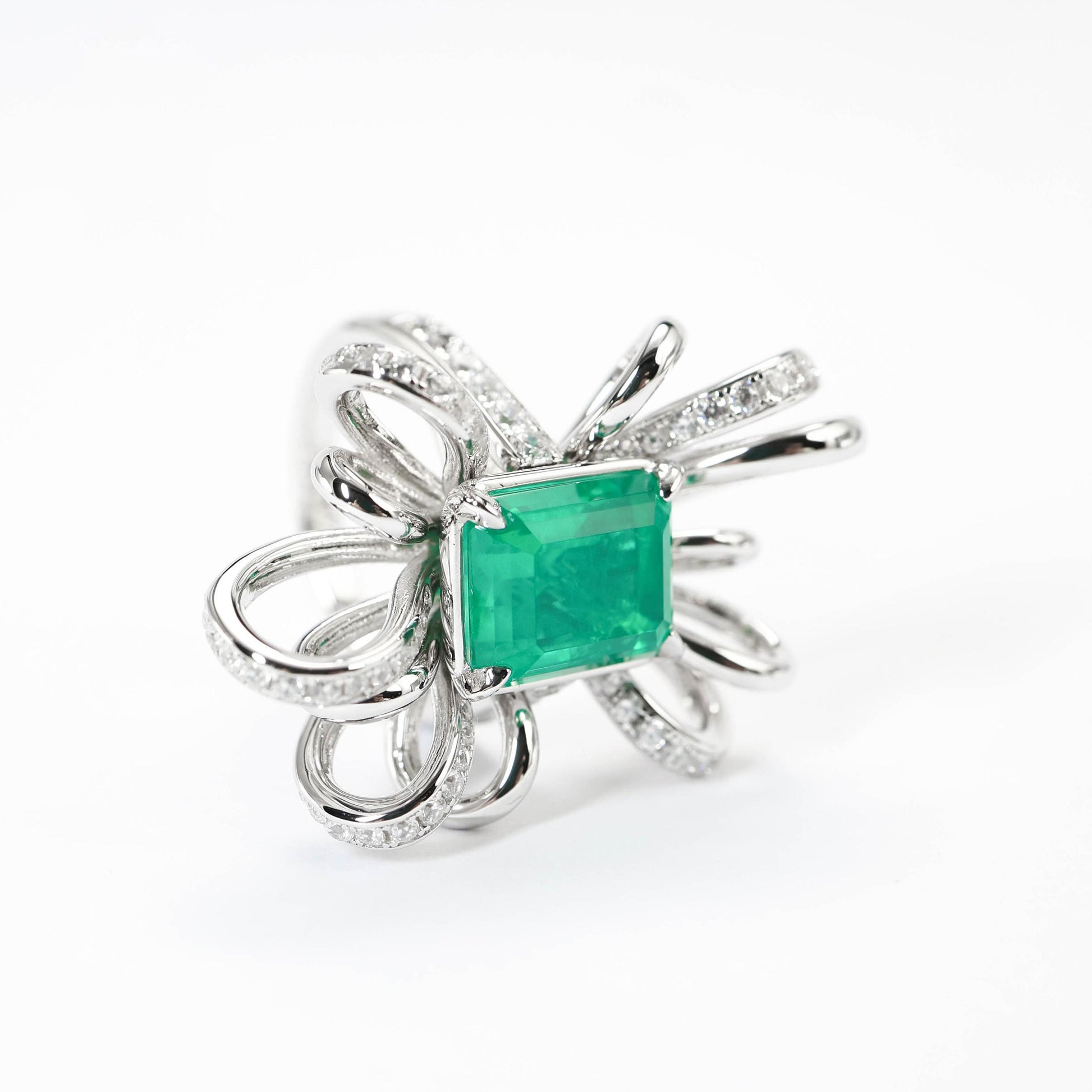 Micro-setting Emerald color Lab created stones fancy bow ring, sterling silver.