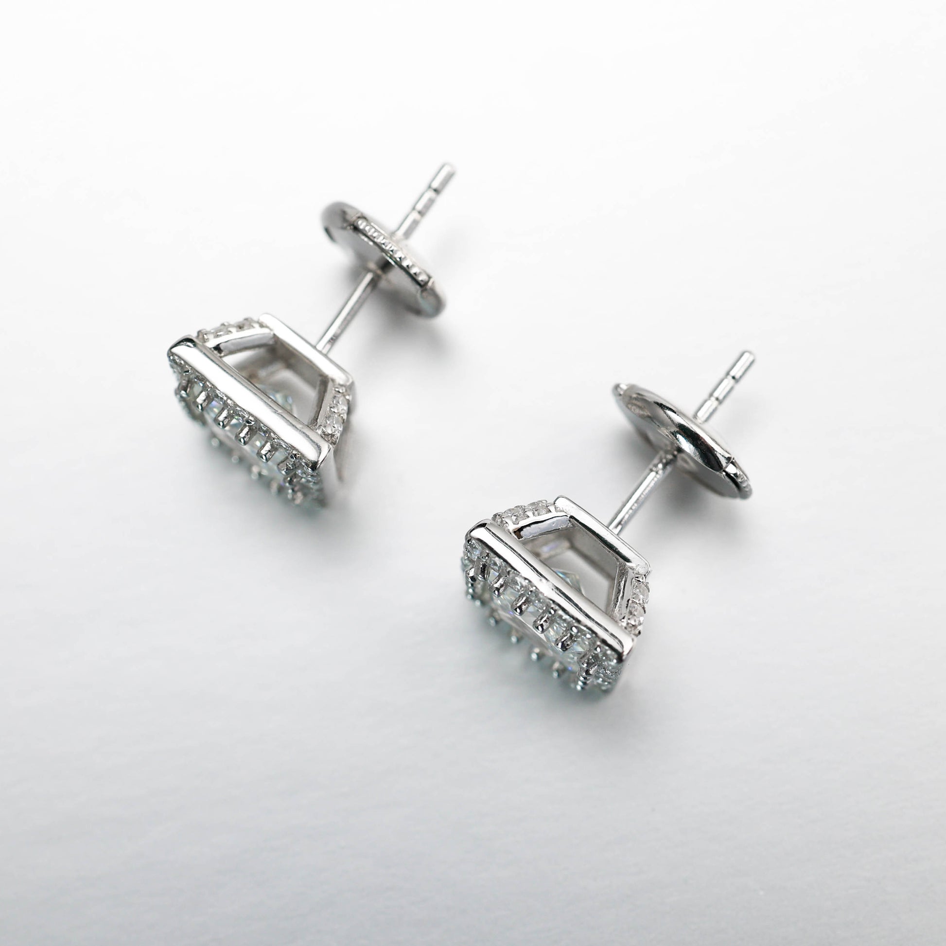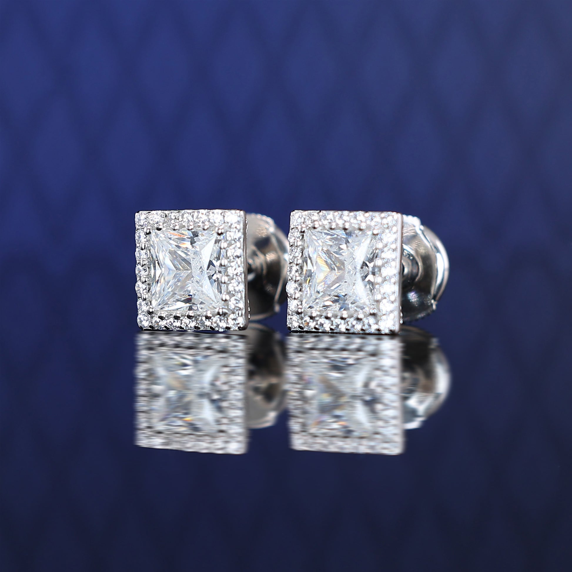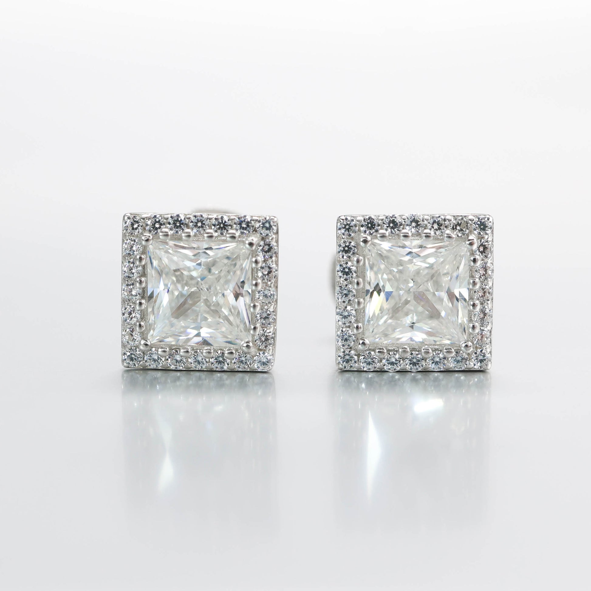 Micro-setting F color princess cut Lab created stones Square shape detailed ear studs, sterling silver.