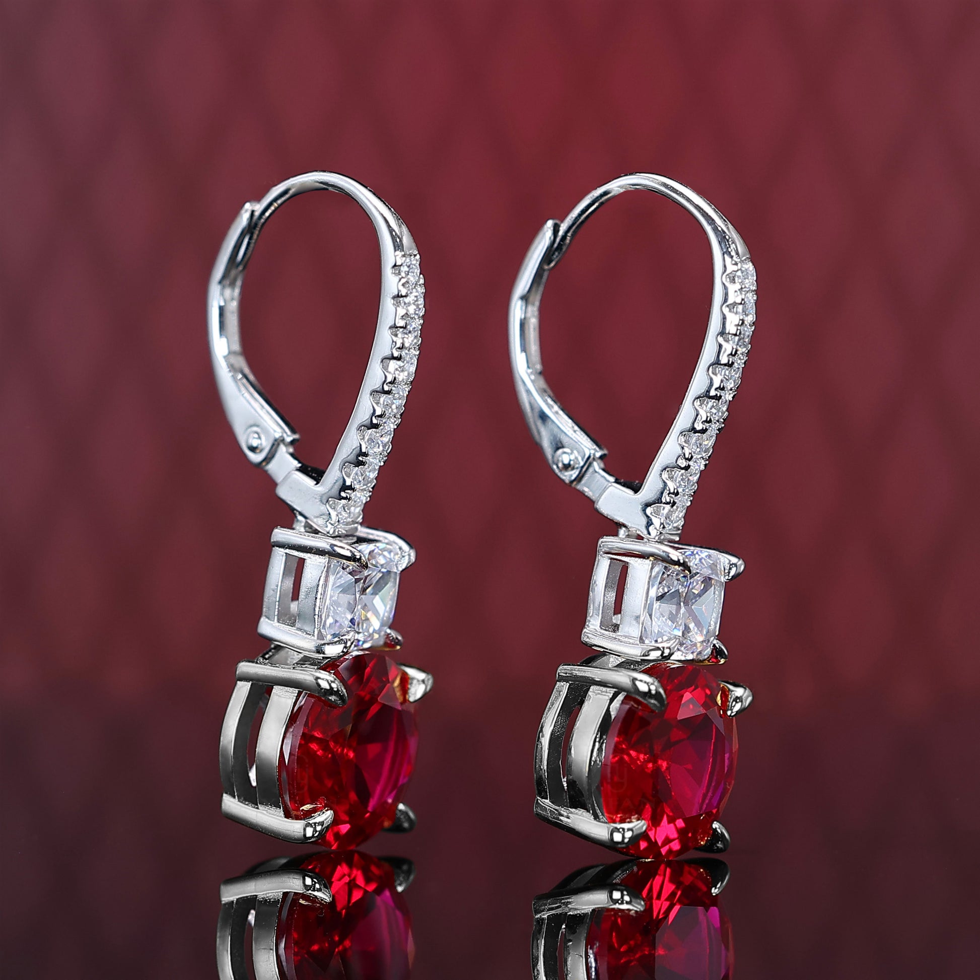 Micro-setting Ruby color round lab created stones 4 prong hook earrings, sterling silver