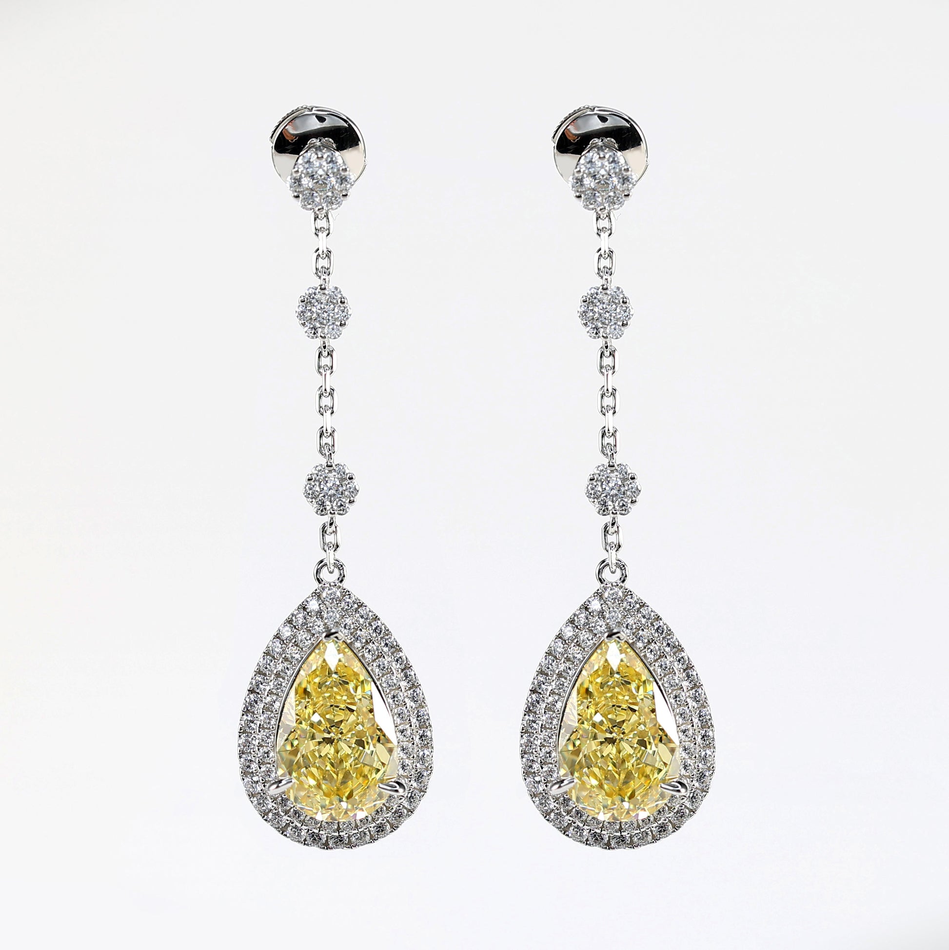 Micro-setting Yellow diamond color Lab created stones Long waterdrop earrings, sterling silver