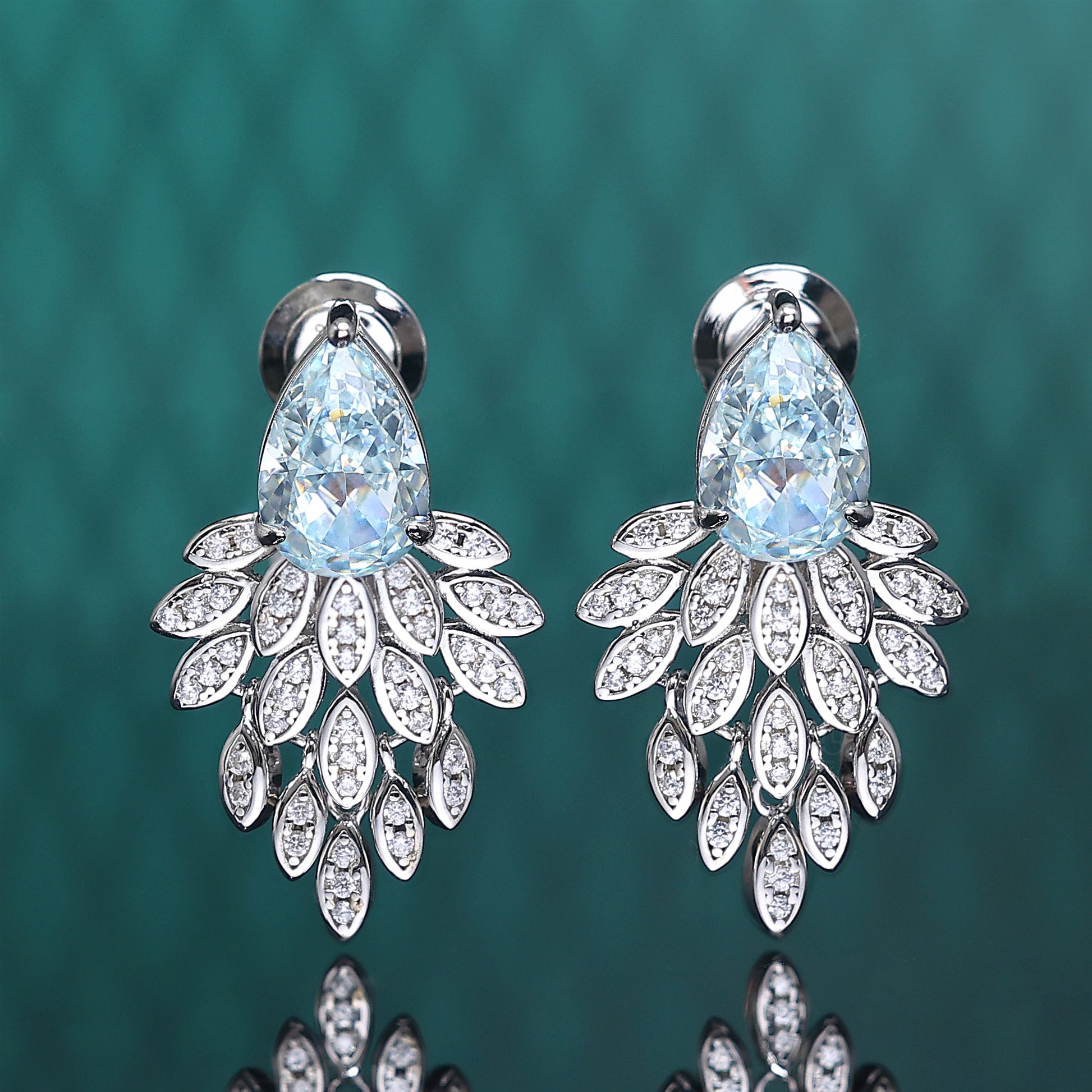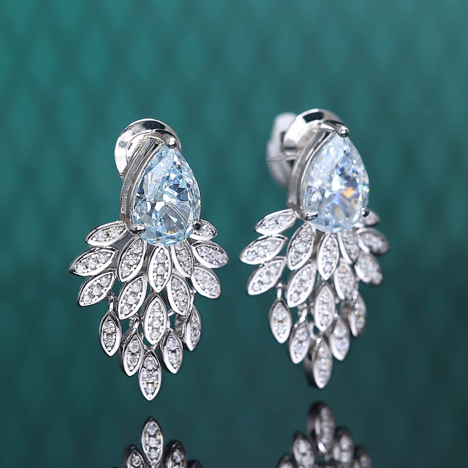 Micro-setting Aquamarine color waterdrop shape Lab created stones rosefinch tail earrings, sterling silver.