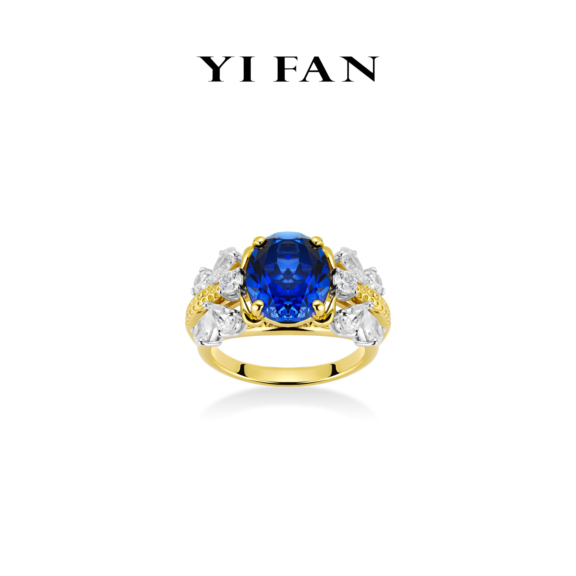 Features a rich 18K yellow gold-plated 925 silver band, exuding regal elegance. At its center sits a vibrant oval blue Lab created artificial gemstone, cradled by golden prongs that elevate its majestic presence. Flanking the blue gem, meticulously cut Lab created artificial diamonds add the sparkle, while the textured gold detailing on the band enhances the ring’s opulent appeal. Perfect for formal occasions or as a statement of refined taste, the ring merges luxurious materials with intricate design—every element, from the gem’s vivid hue to the precision of stone settings, reflects Elsevier Jewelry & YIFAN’s dedication to craftsmanship, making it a timeless piece for those who embrace grandeur and sophistication.