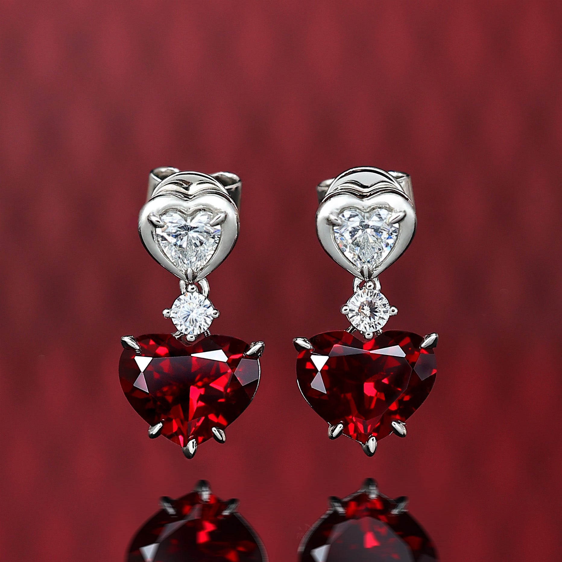 Micro-setting Ruby color Lab created stones heart earrings, sterling silver.