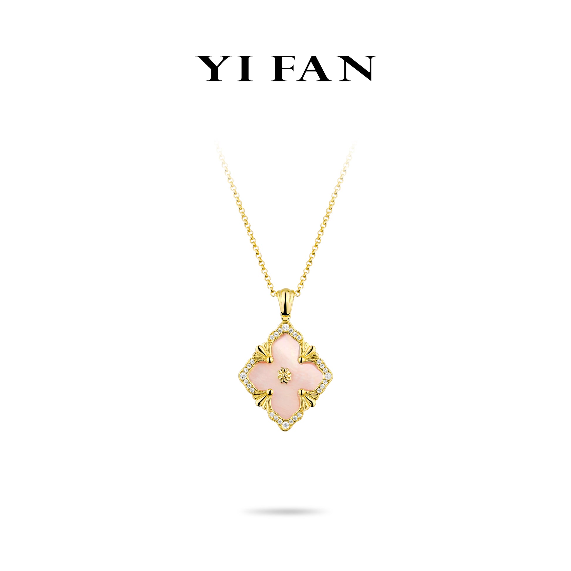 Golden time collection: Modern "Pink Mother-of-Pearl carved 4-petal Flower" detailed Pendant Necklace