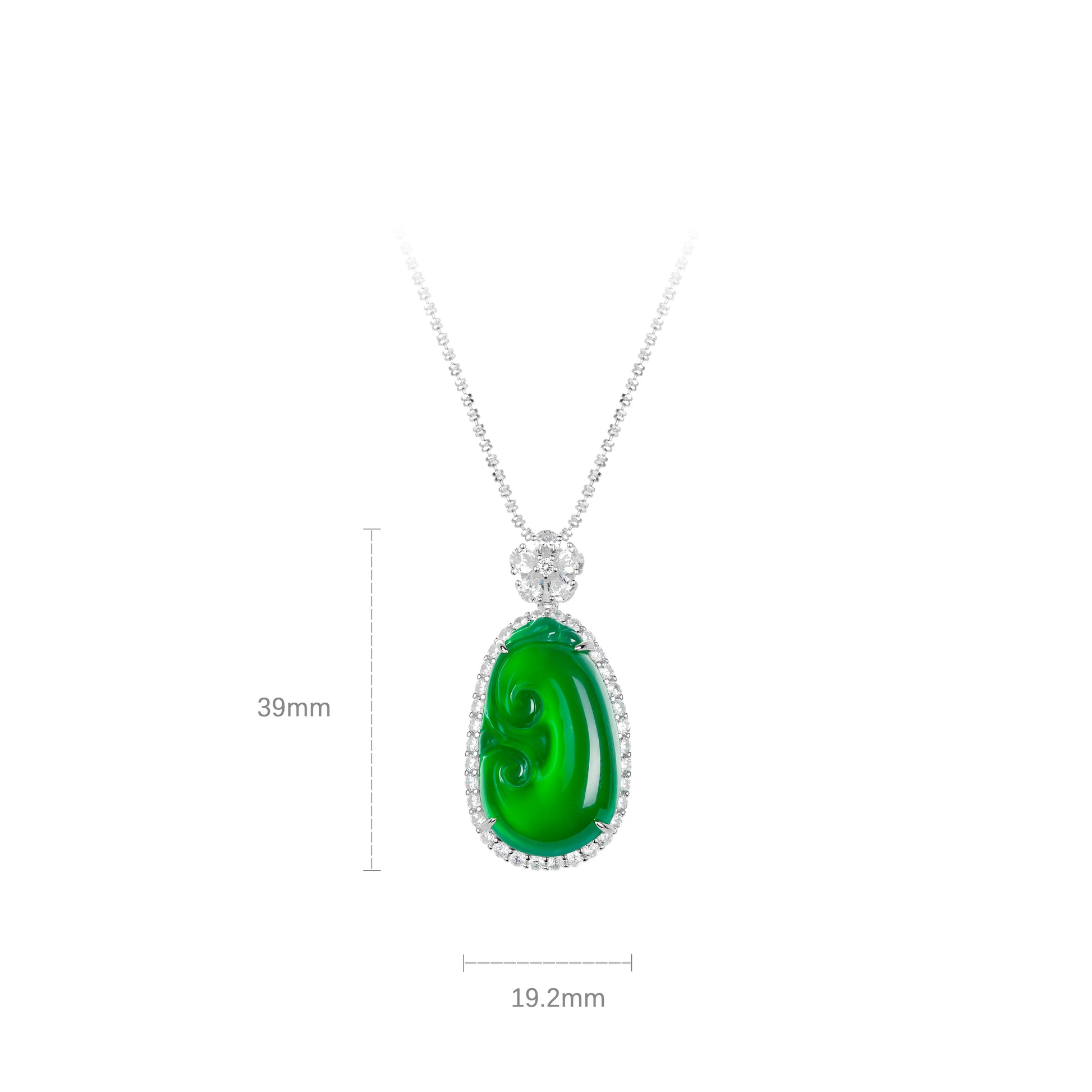 Crafted with Lab created artificial diamonds and handcarved Green Jade, in sterling silver.
