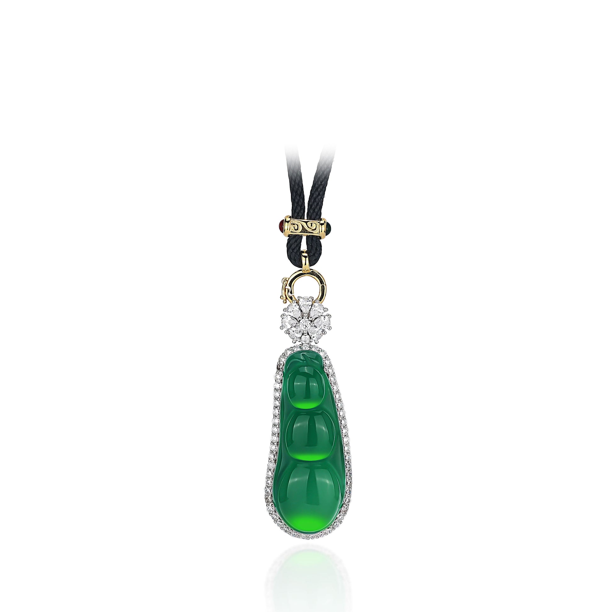 The necklace features a delicate pea-shaped pendant made from green jadeite, renowned for its natural, vibrant color and symbolism of purity and tranquility.