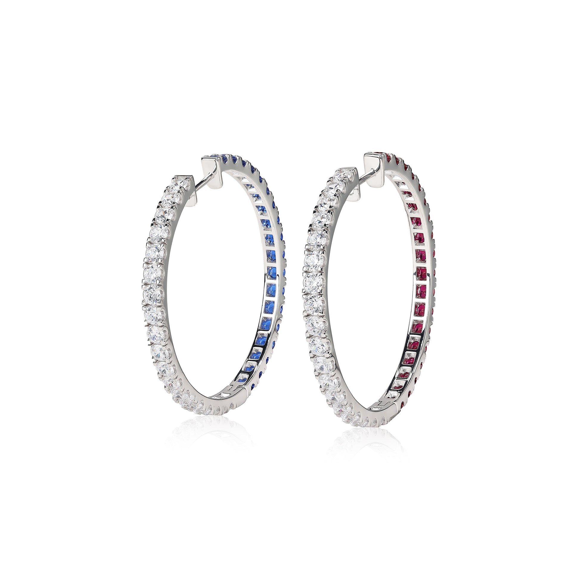Micro-setting Ruby and Sapphire color Lab created stones hoop earrings.