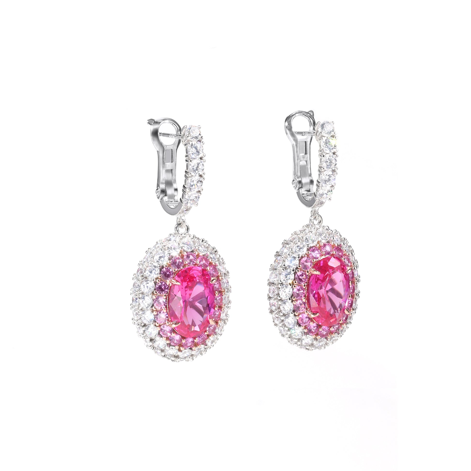 Micro-setting dark oval Pink diamond color Lab created stones Romantic Luxury dangle plug earrings, sterling silver