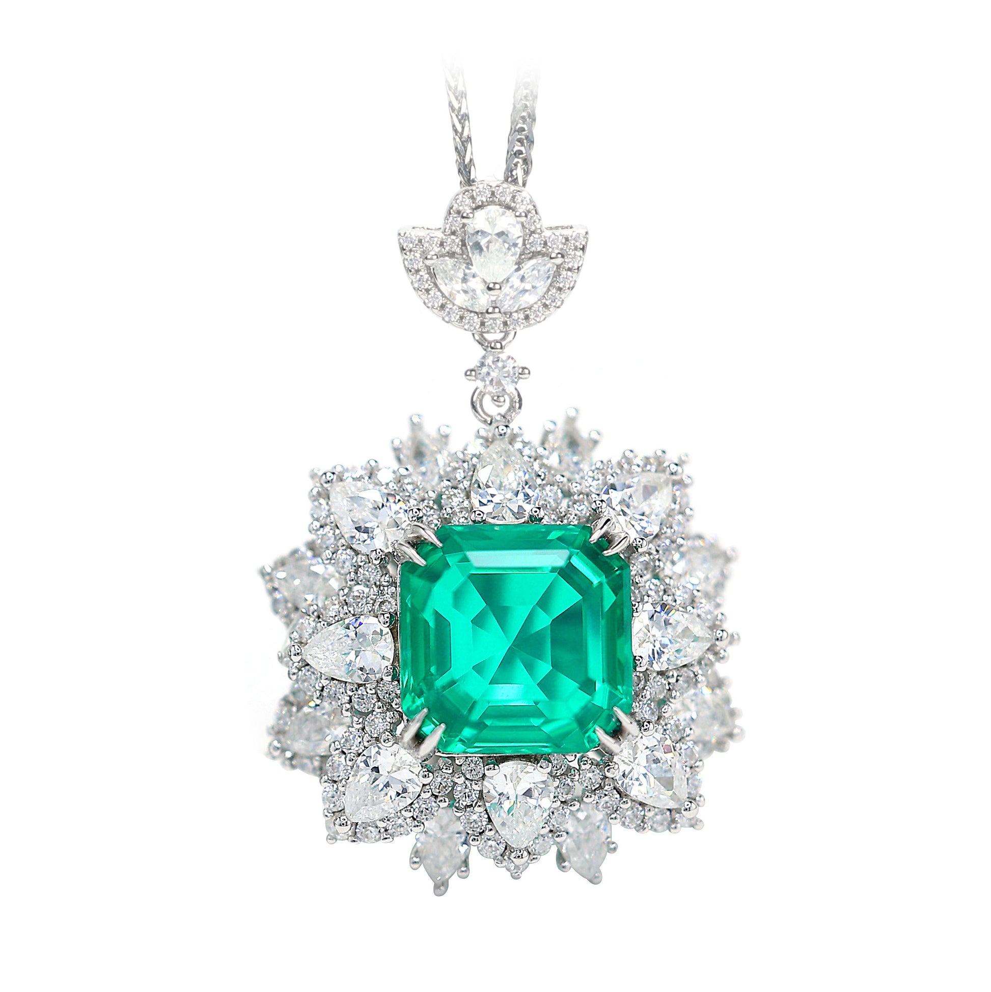 Micro-setting Emerald and diamond color mixed cutting Lab created stones fancy square shape fully studded pendant, sterling silver.