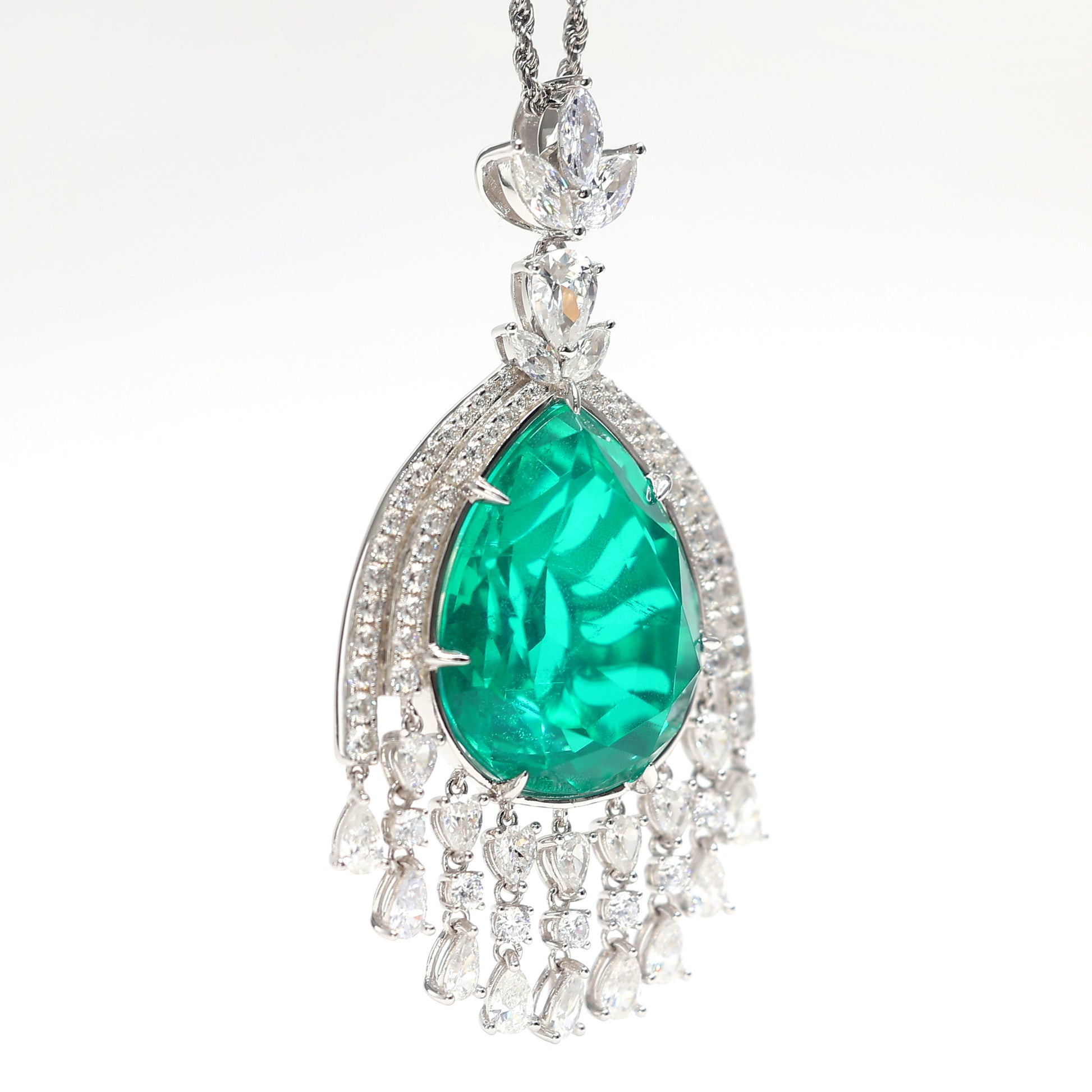 Collier en forme de goutte d'eau fantaisie avec pierres créées par le laboratoire couleur émeraude micro-serti, argent 925/1000e.
