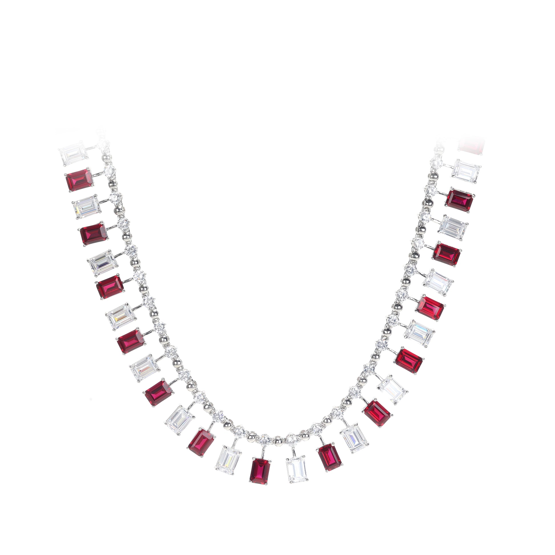 Micro-setting Ruby color Lab created stones Emerald cut modern necklace , sterling silver