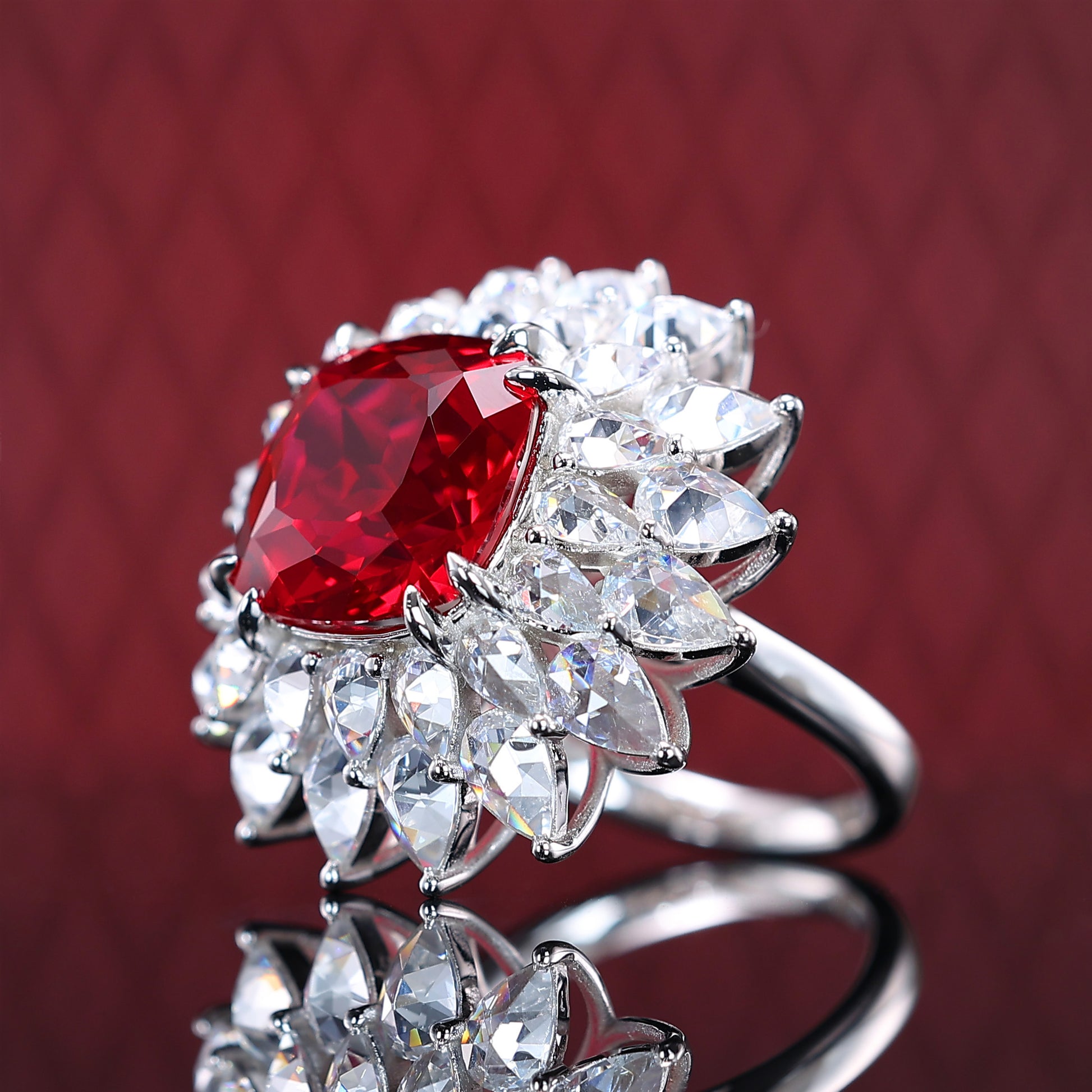 Couleur rubis Pierres créées par le laboratoire Bague tournesol fantaisie, argent sterling. (14 carats)