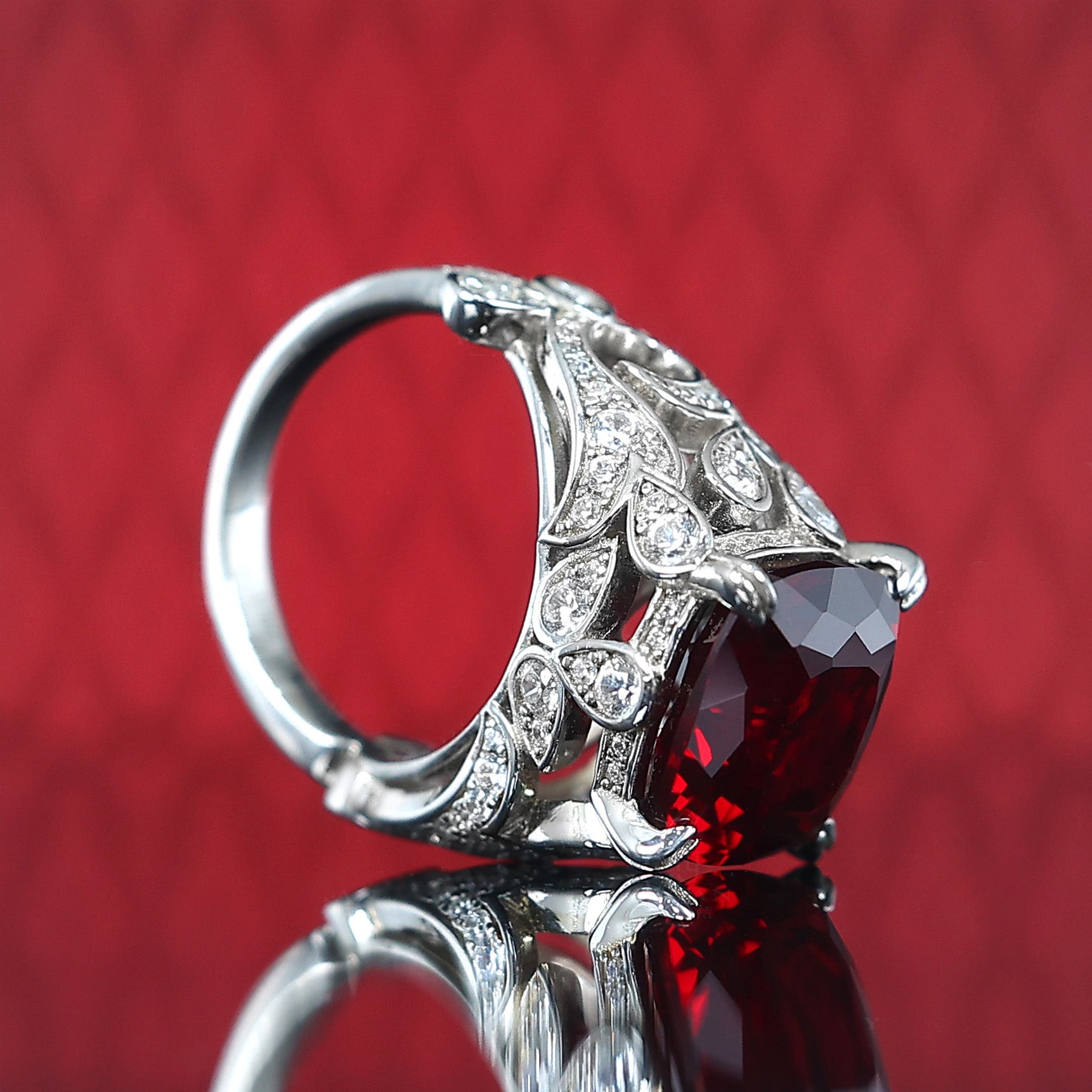Micro-serti Couleur rubis Forme carrée Pierres créées en laboratoire Oiseaux rendant hommage à la bague phénix, argent massif. (9,55 carats)
