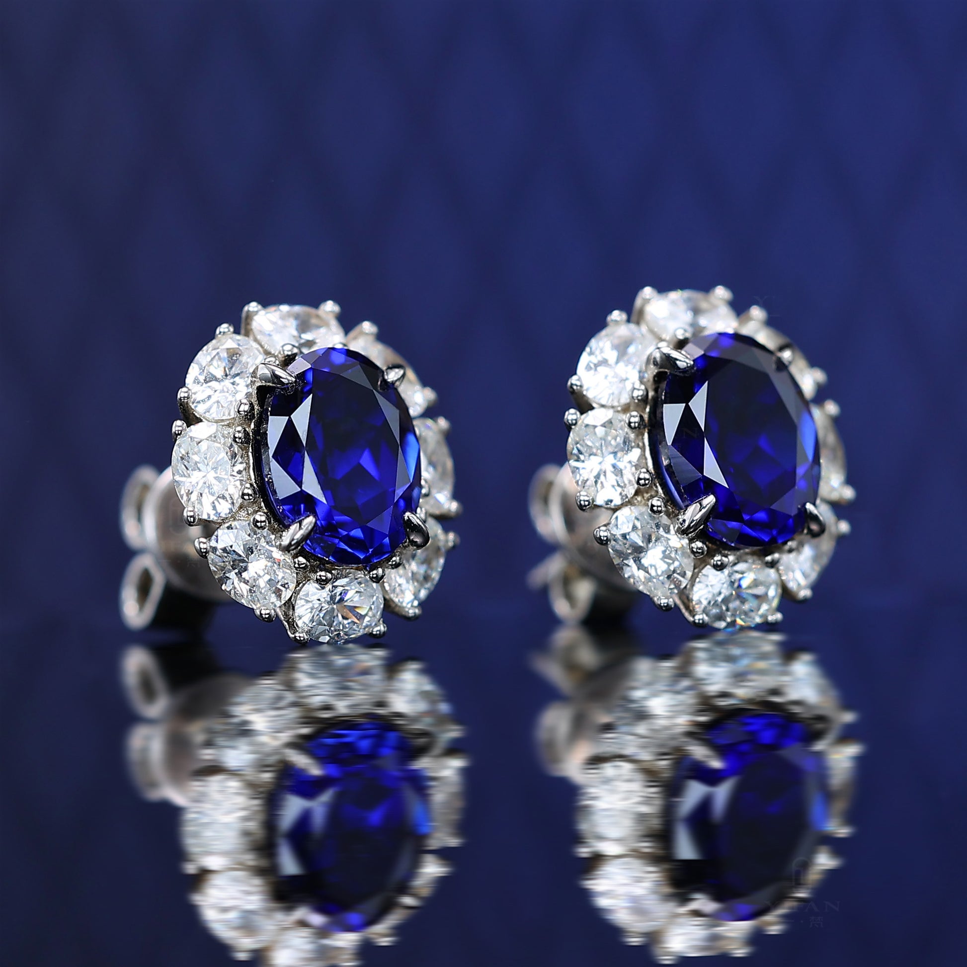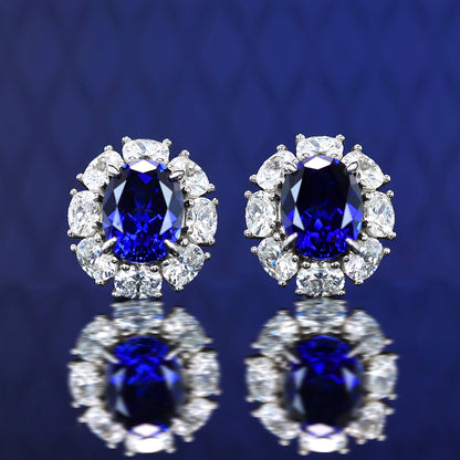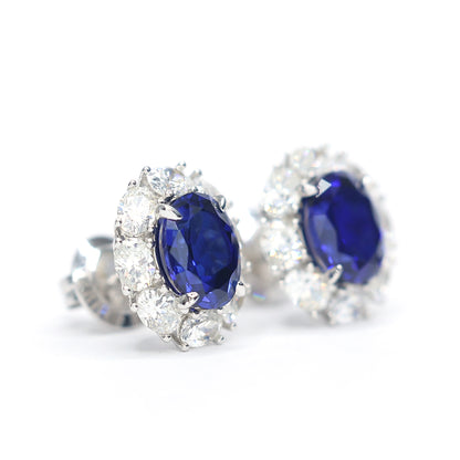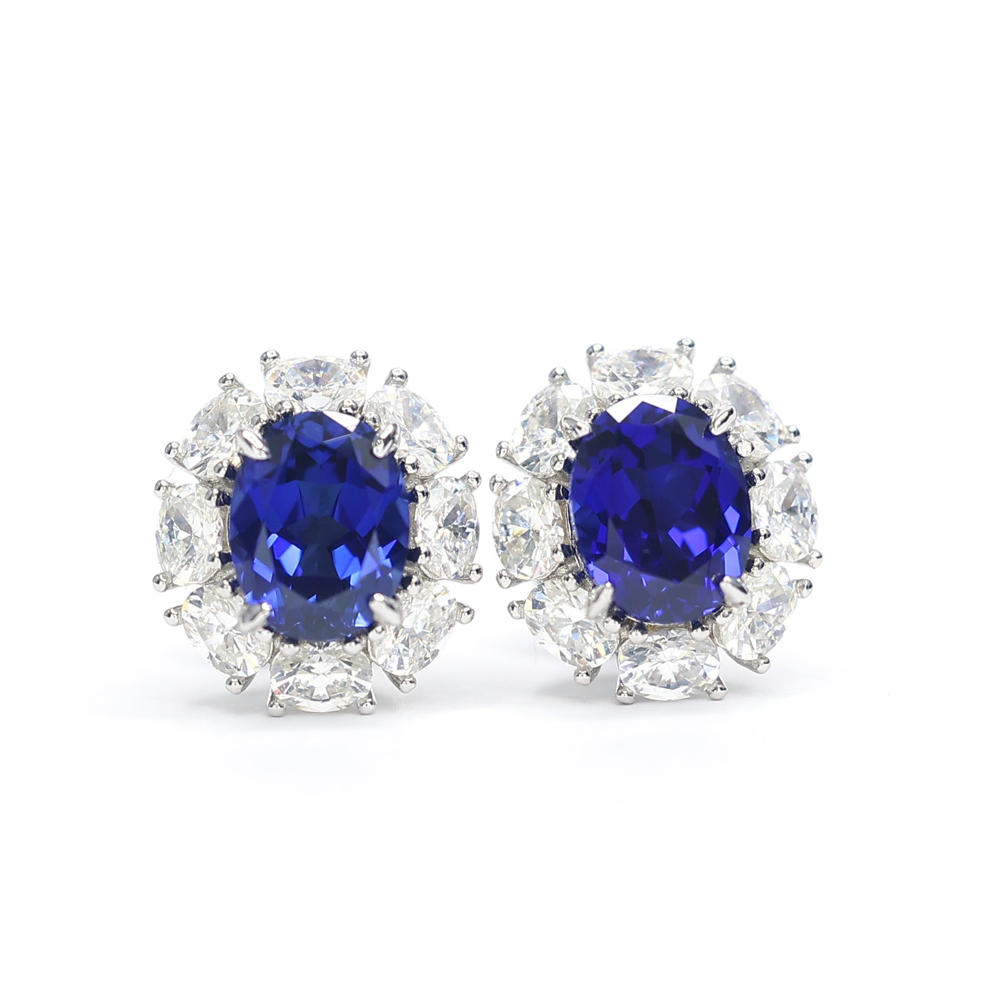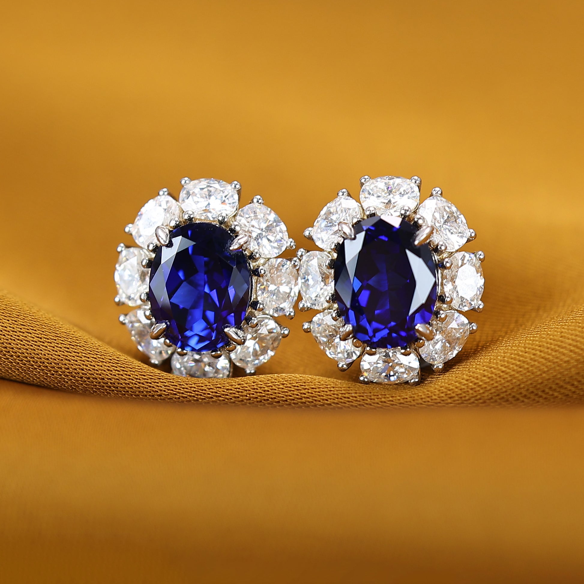 Boucles d'oreilles diana de forme ovale en pierres créées par laboratoire de couleur saphir micro-serti, argent sterling.