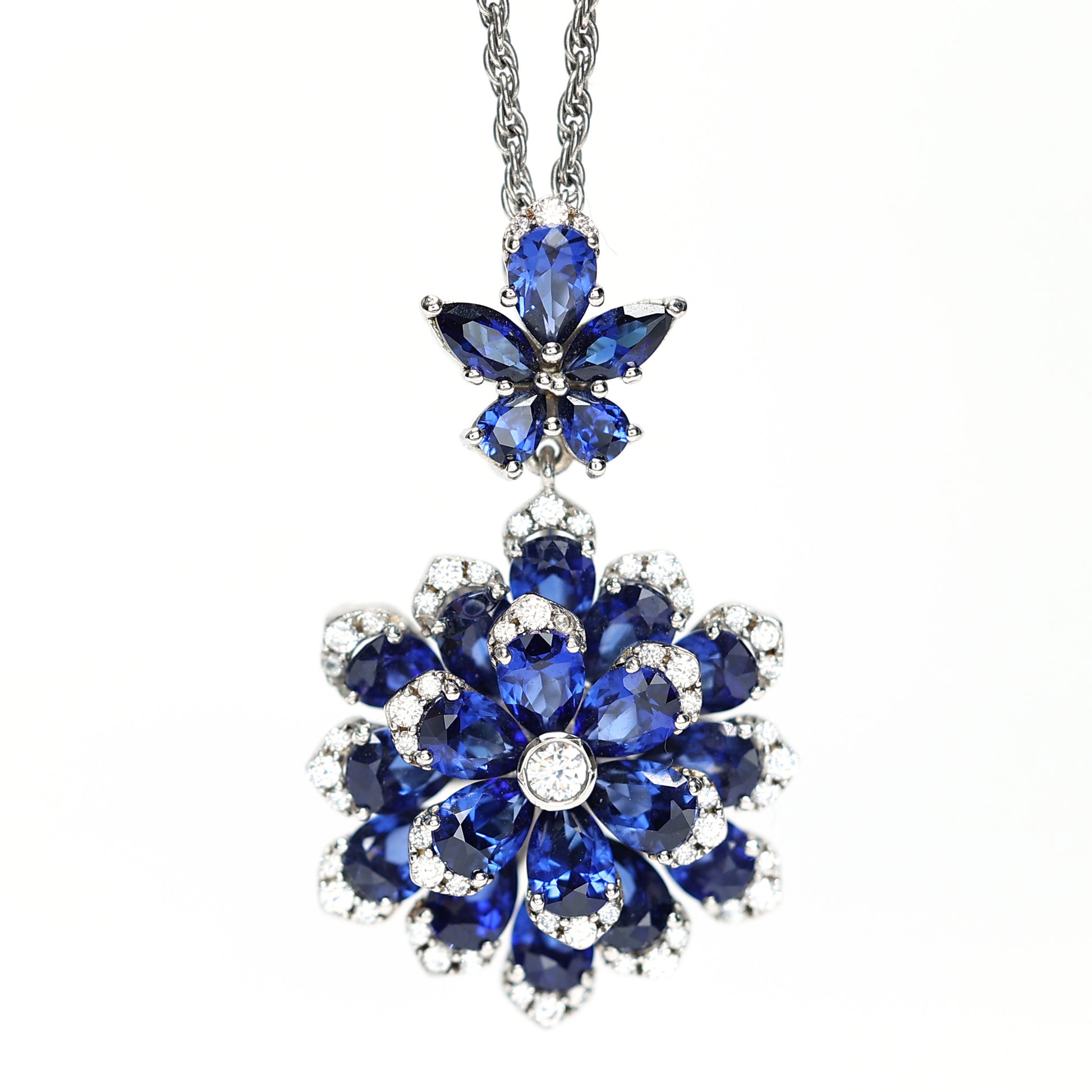 Collier de fleurs fraîches conservées en pierres précieuses de laboratoire couleur saphir micro-serti, argent sterling.