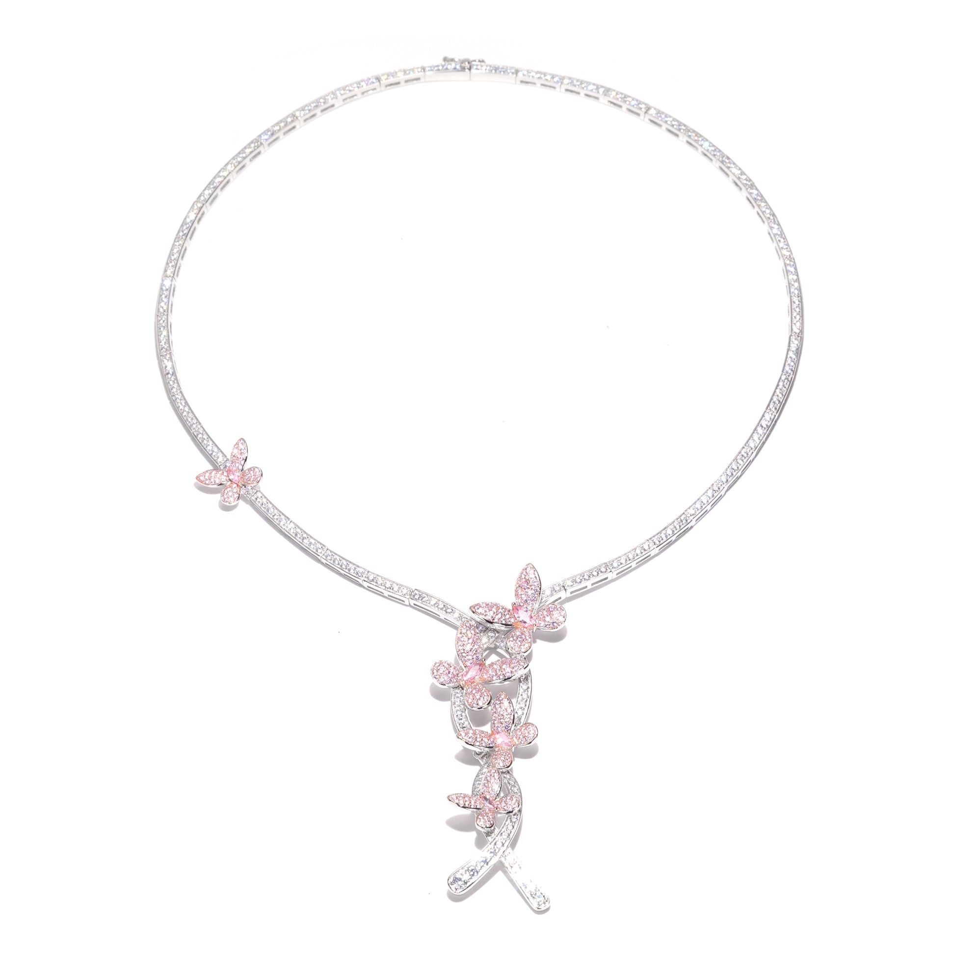 Reservation design Micro-setting Pink and clear diamond color CZ 5 Butterflies Necklace, sterling silver