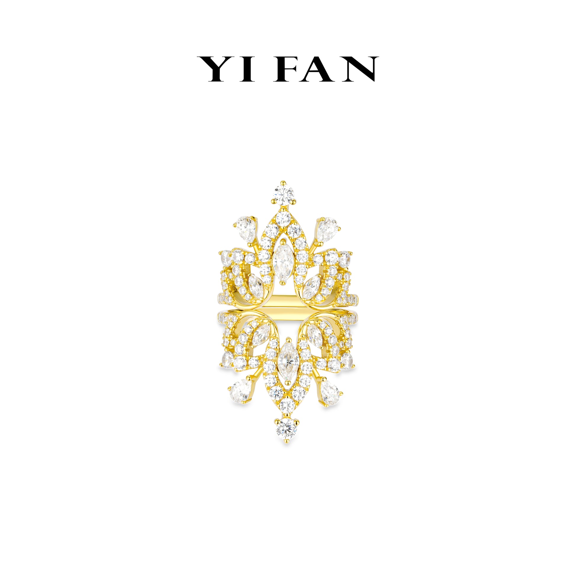 This ring features an opulent crown-inspired design, crafted with a golden base and adorned with meticulously set Lab created artificial diamonds in varied cuts—marquise, round, and pear—creating a dazzling interplay of light. The highlight lies in its multi-wear functionality: effortlessly adjust the ring’s orientation or combine with other pieces (if applicable) to transform its look, adapting from a bold statement piece for formal events to an elegant accessory for daily wear. The 925 silver with 18K Yellow gold plating ensures a luxurious finish, while the intricate detailing—from the central diamond accent to the symmetrical crown motifs—exudes regal charm. Perfect for those who seek versatility without compromising on style, this ring is a testament to Elsevier&Yifan jewelry's innovative craftsmanship, letting you redefine elegance with every wear.