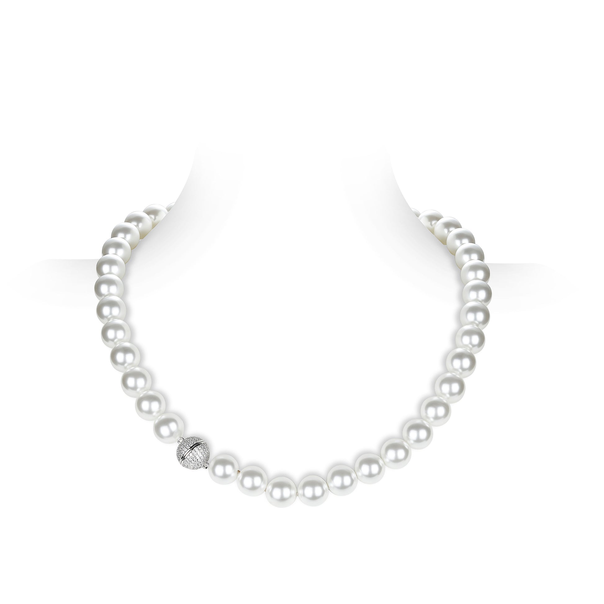 Featuring with Lustrous high quality Shell Pearls in white tone. with ball clasp set with eco-friendly artificial diamonds, in sterling silver.