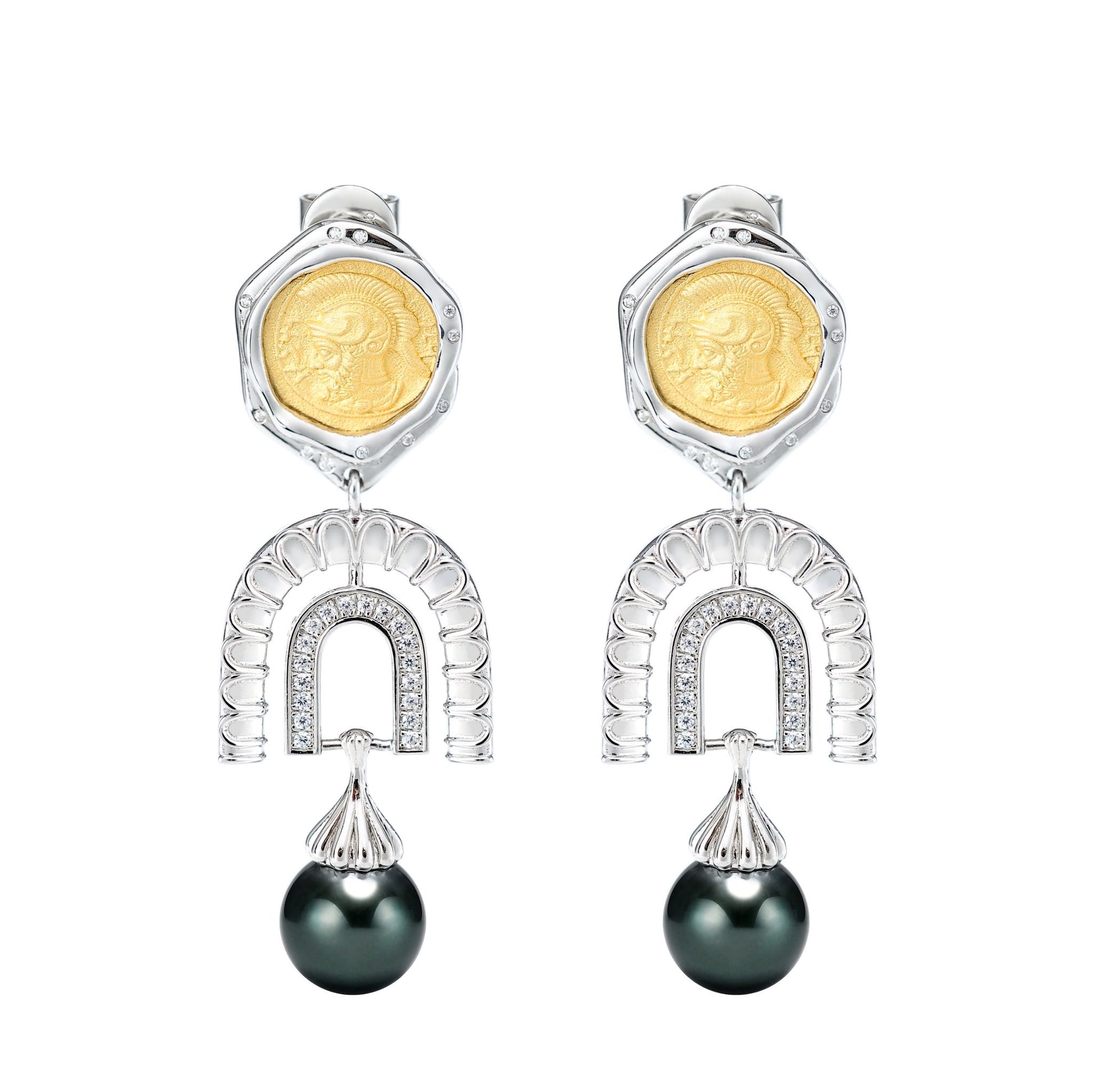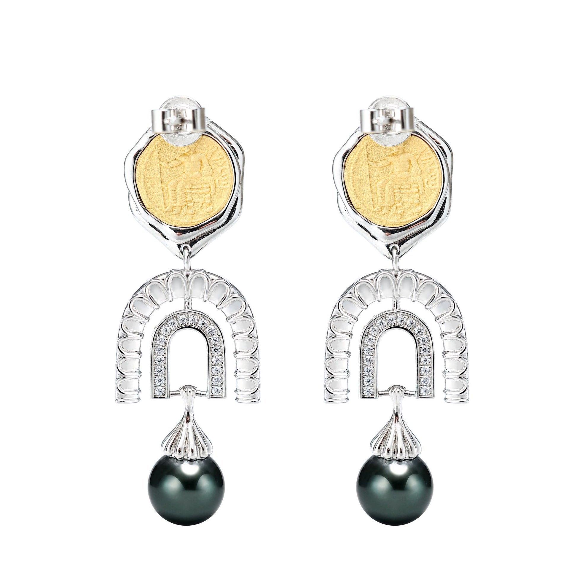 Micro-setting ancient coin Lab created stones Grey shell pearl God of War Ares cage earrings , sterling silver