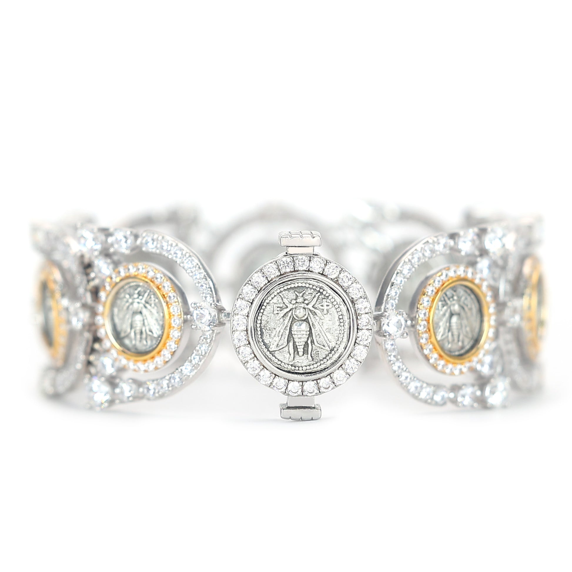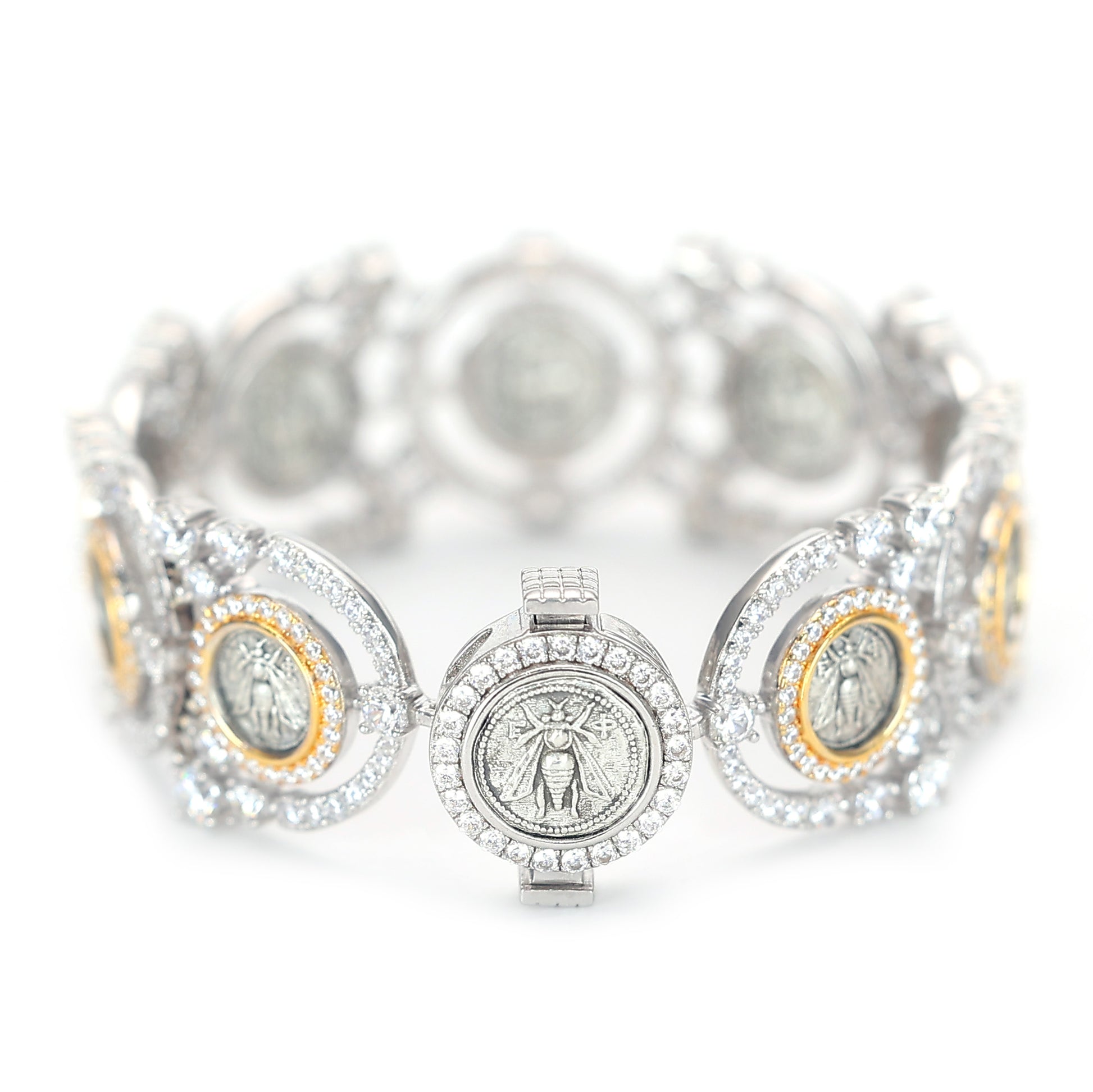 Micro-setting Lab created stones two-sided ancient coins The Bee Ares bracelet, sterling silver. Double platting