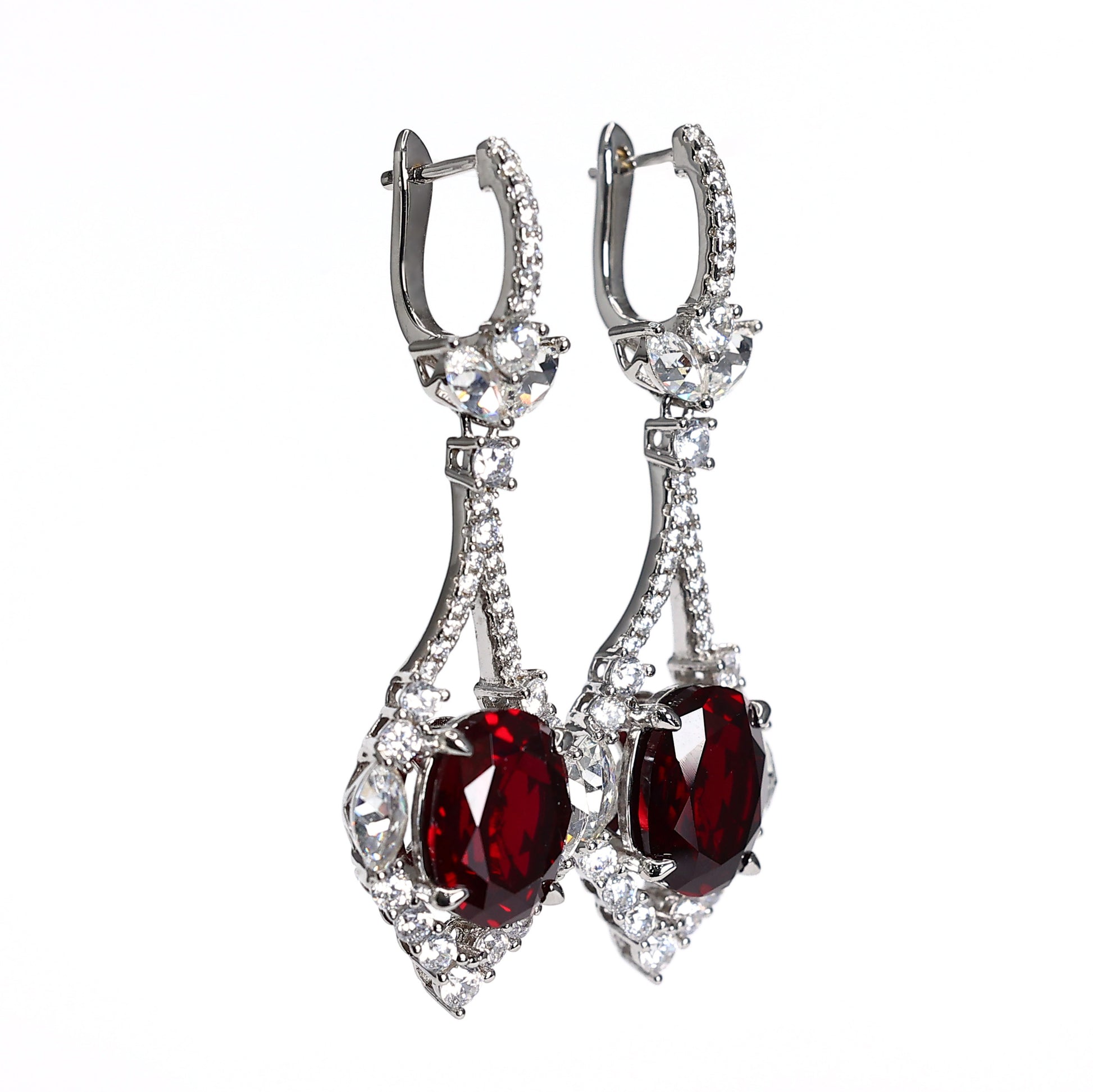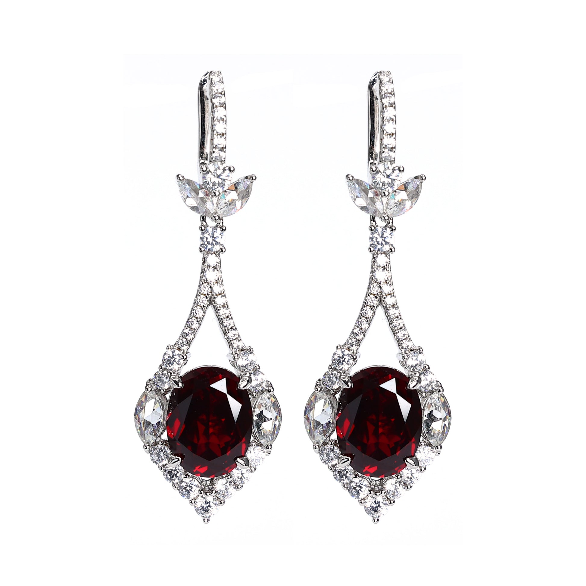 Micro-setting Ruby color lab created stones fancy earrings, sterling silver.