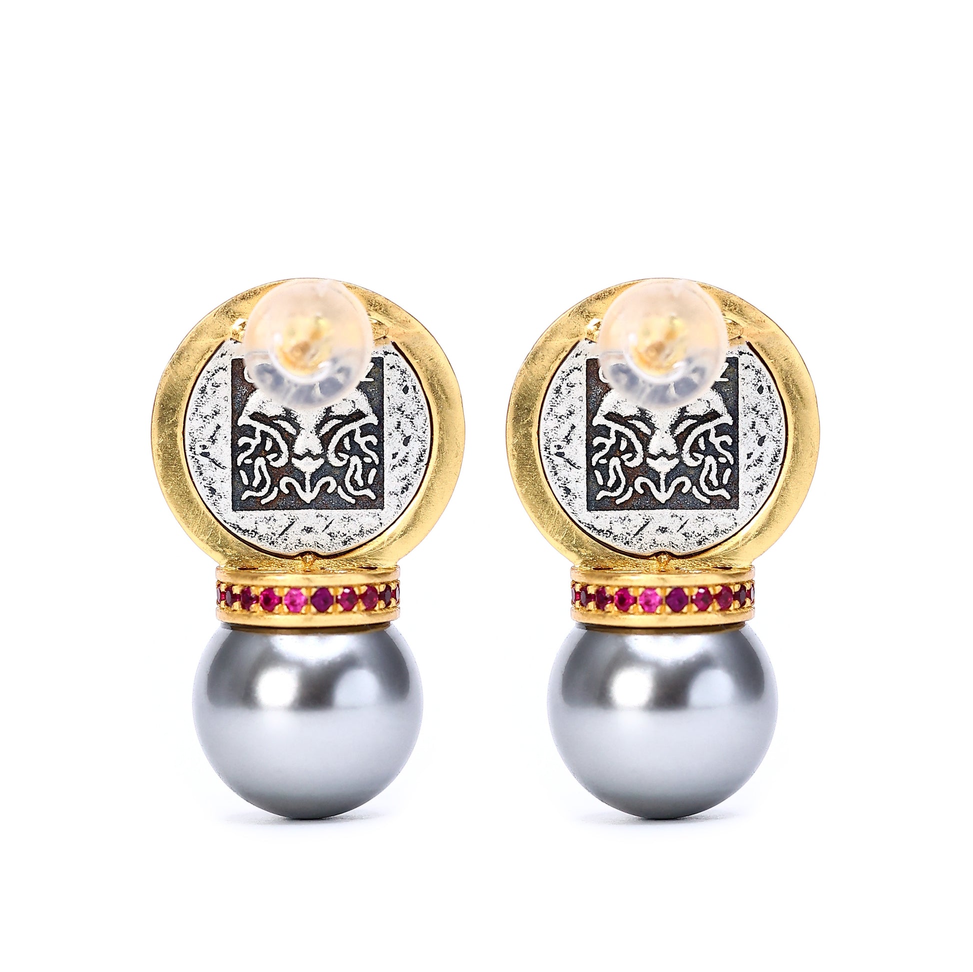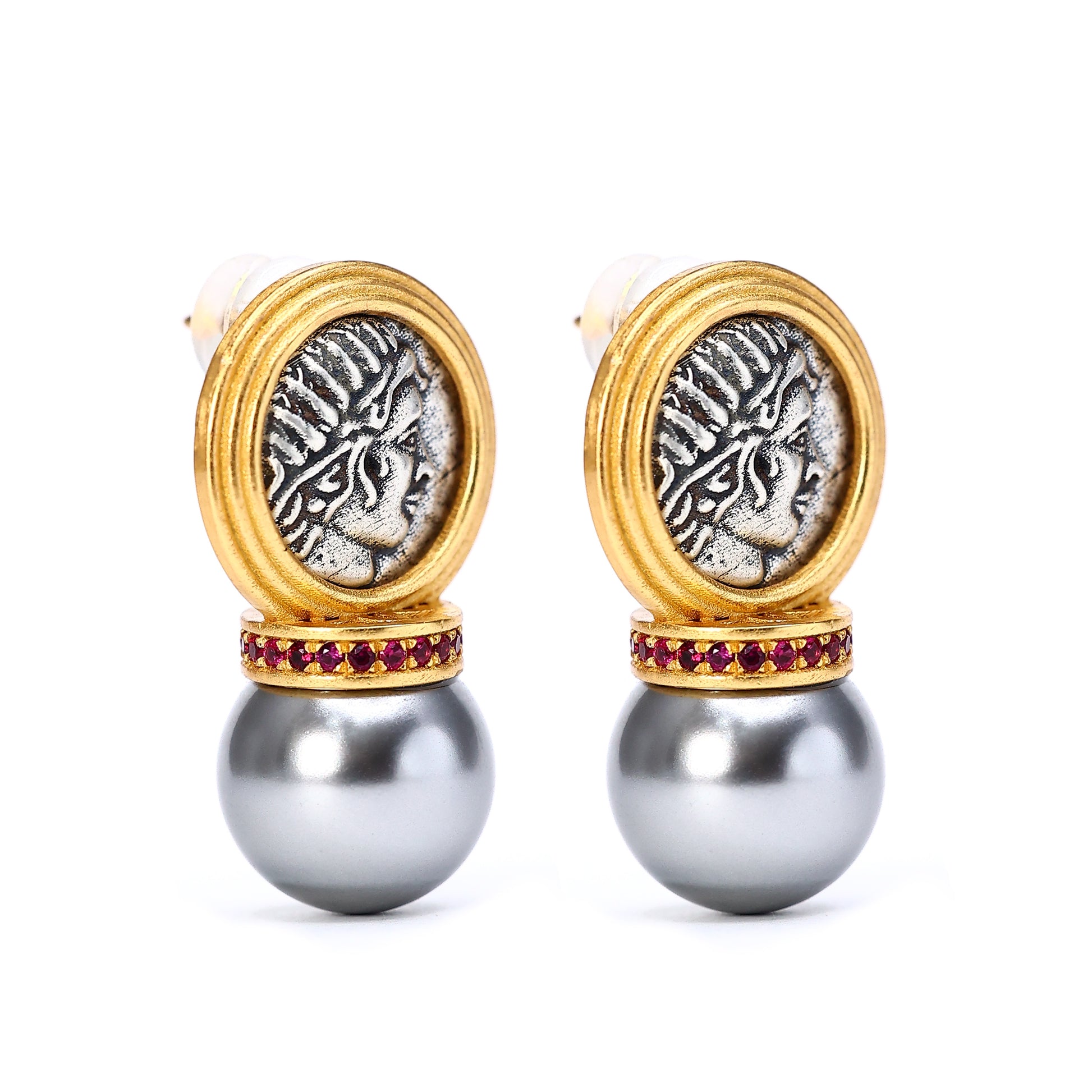 Micro-setting two-sided ancient coin rose Lab created stones Apollo earrings, sterling silver.