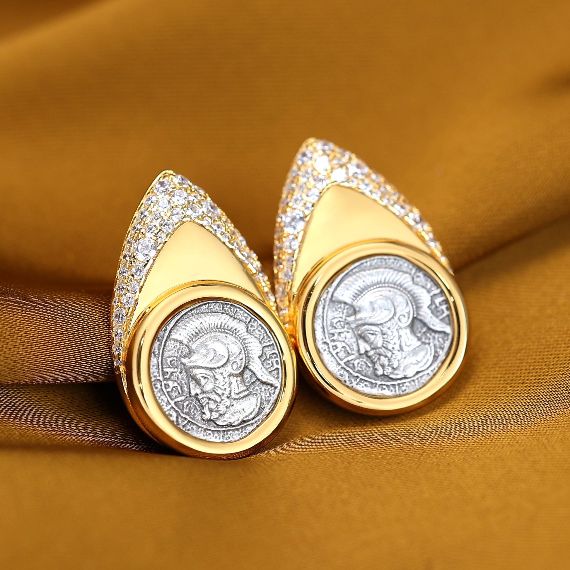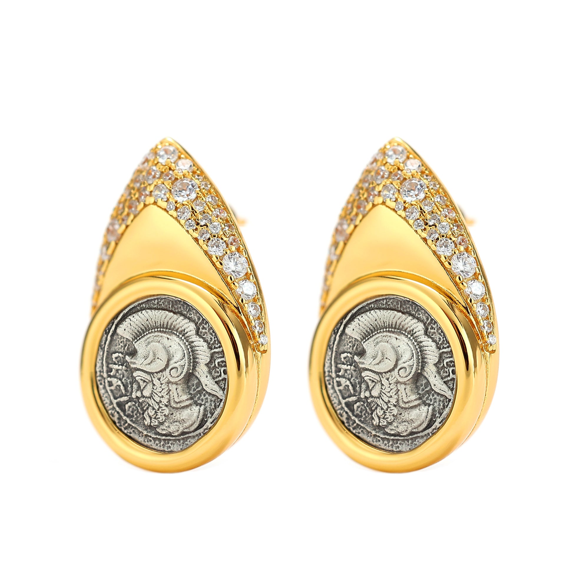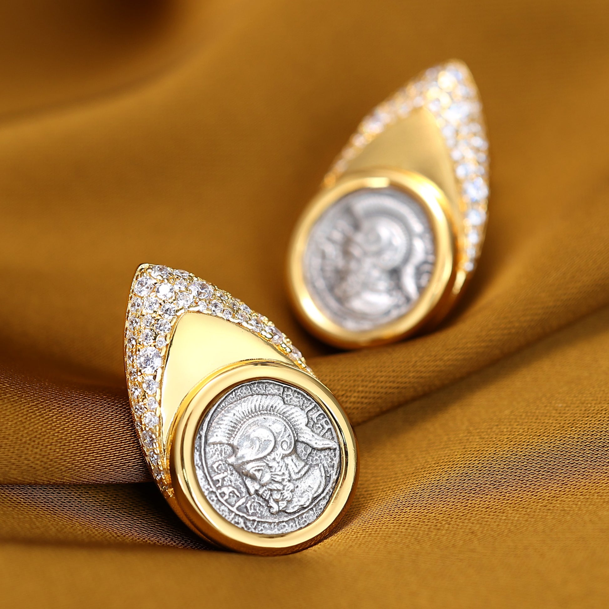 Micro-setting two-sided ancient coin God of war Ares earrings, sterling silver