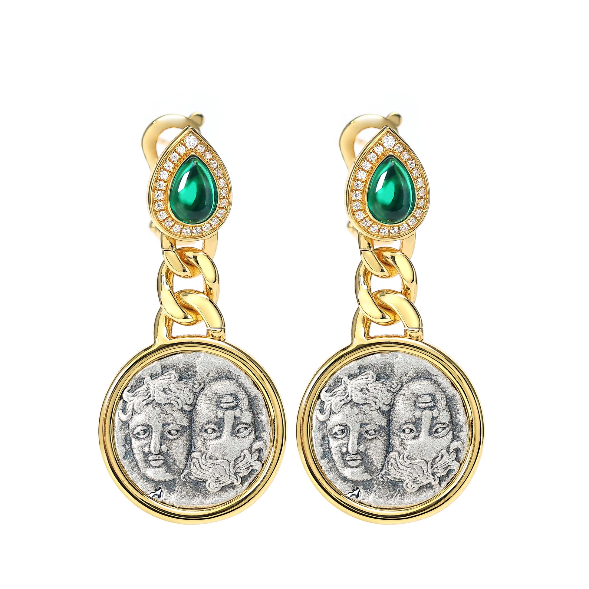 Micro-setting two-sided ancient coin Lab created stones Moses Gemini earrings, sterling silver.