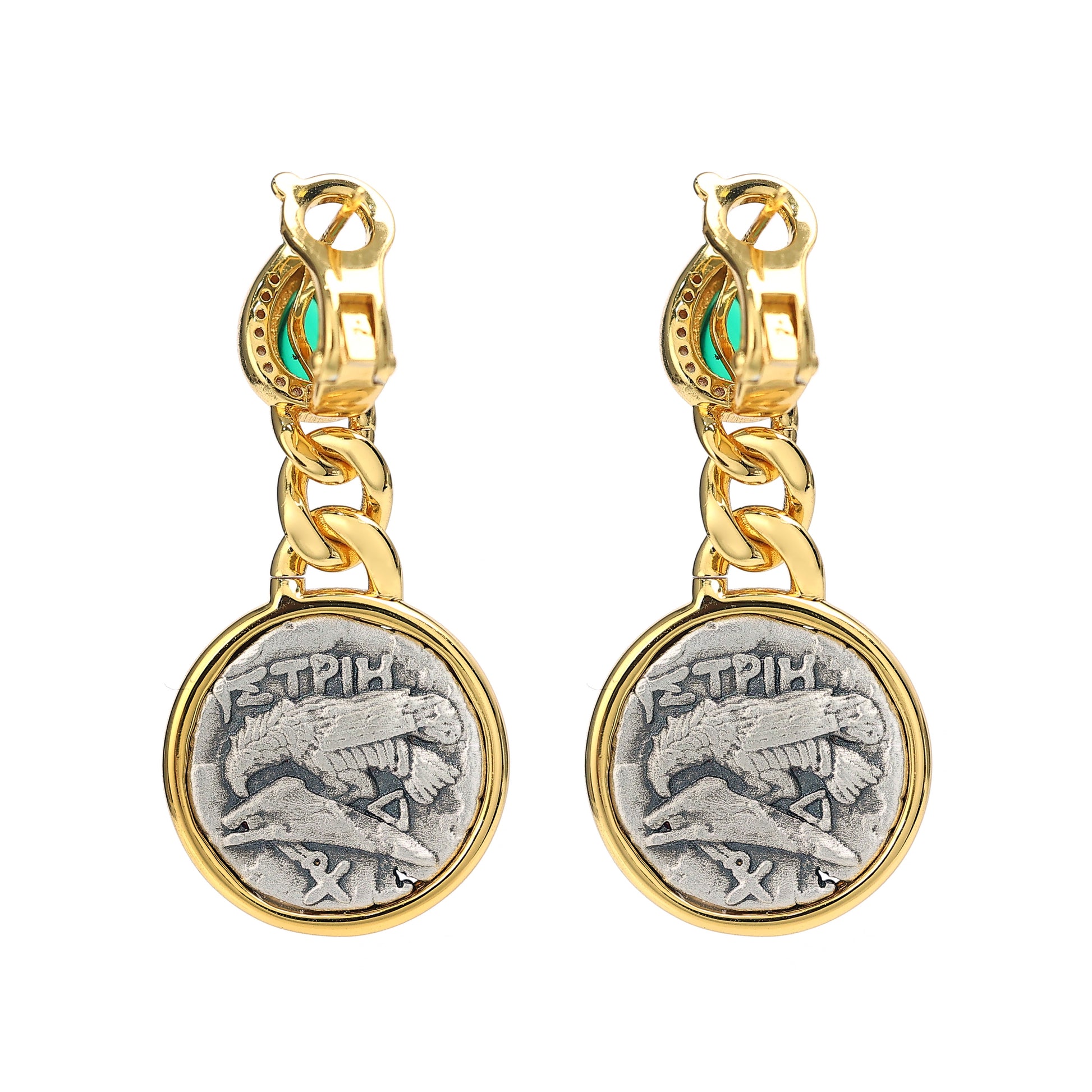 Micro-setting two-sided ancient coin Lab created stones Moses Gemini earrings, sterling silver.