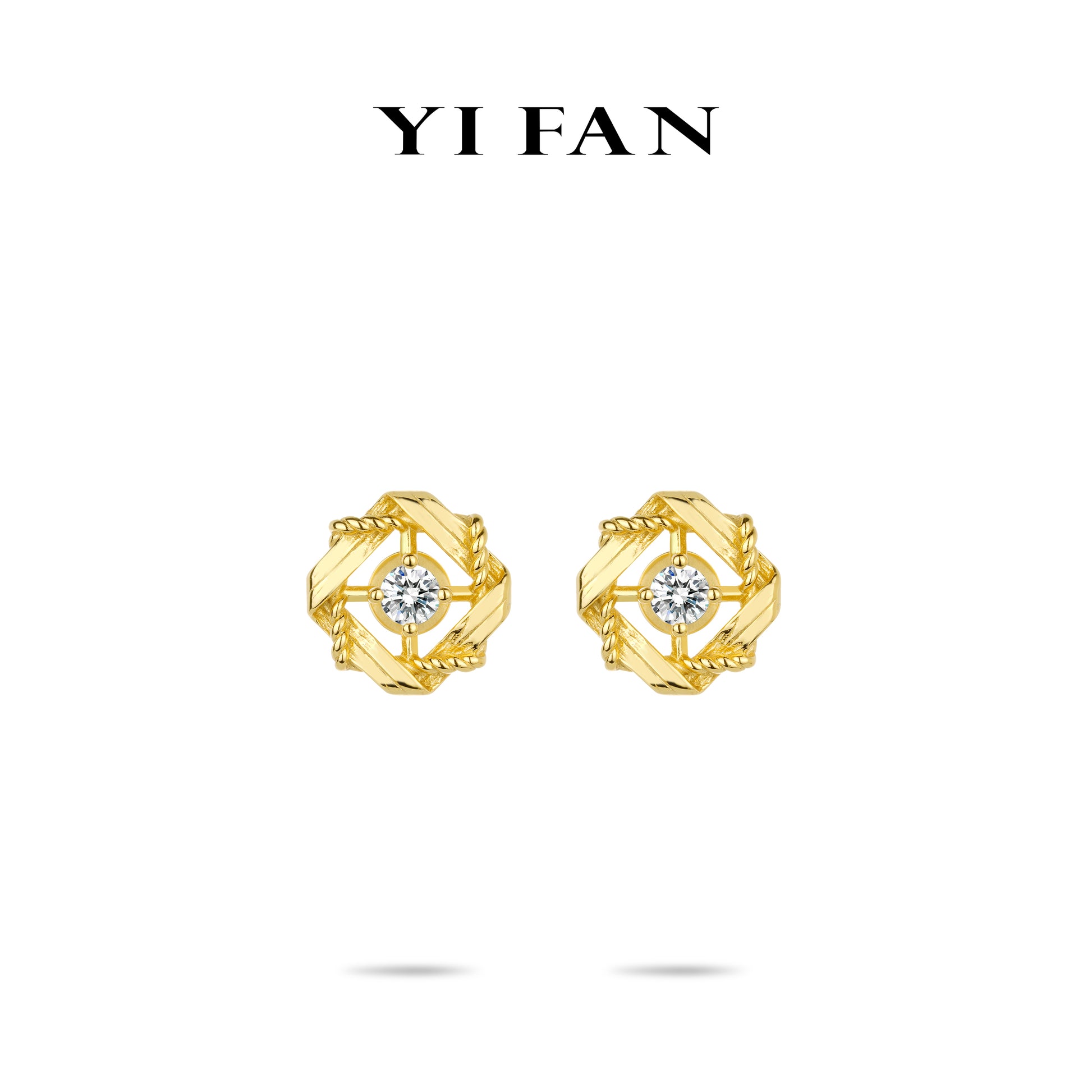 Crafted with 18K yellow gold-plated 925 silver, these earrings showcase an intricate geometric design: interwoven golden lines form a dynamic orbital pattern, while a central Lab created artificial diamond emits brilliant sparkle. The interplay of smooth metal textures and delicate diamond detailing exudes refined luxury. Ideal for enhancing daily outfits or pairing with formal wear, they merge modern geometric artistry with timeless elegance.